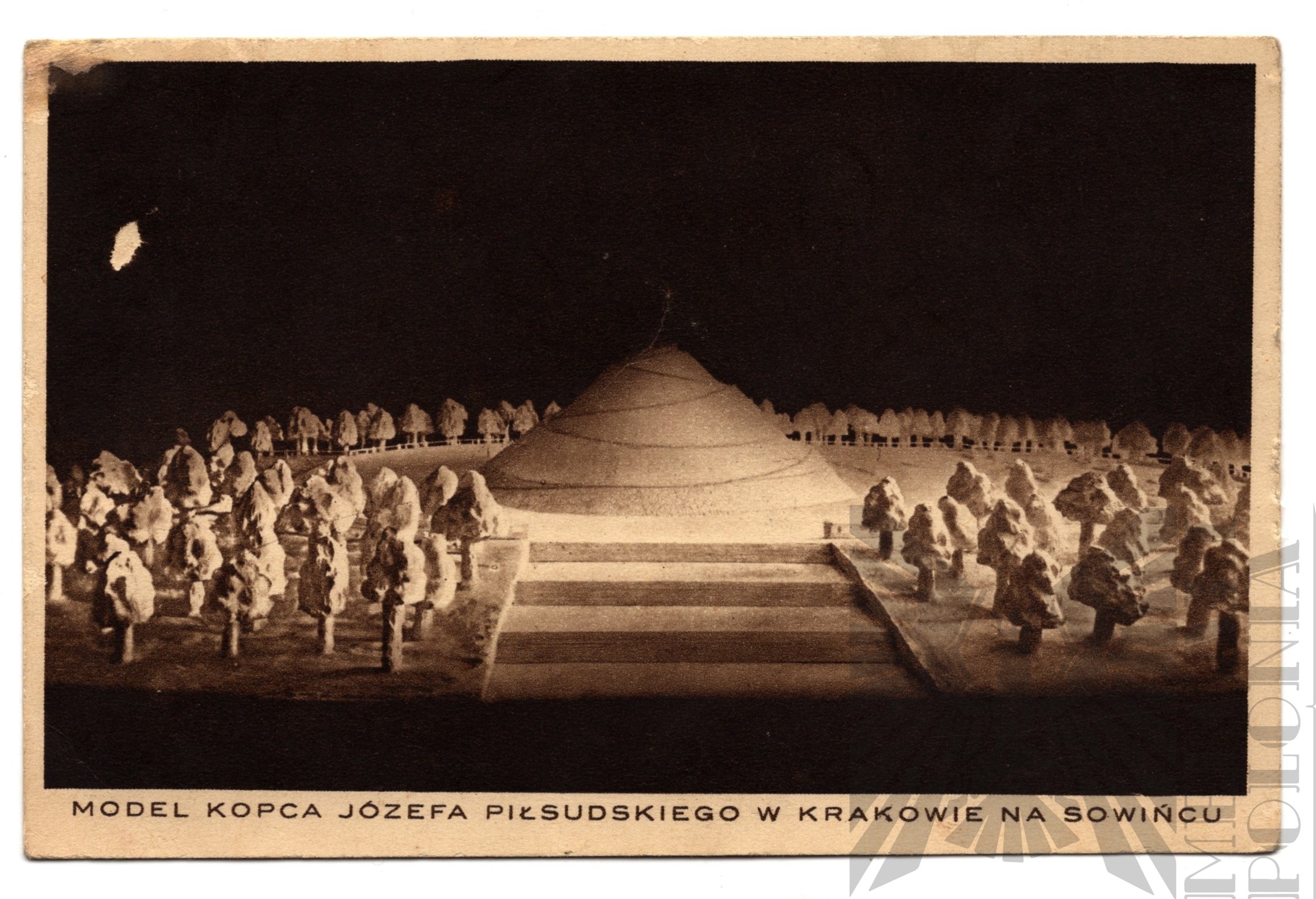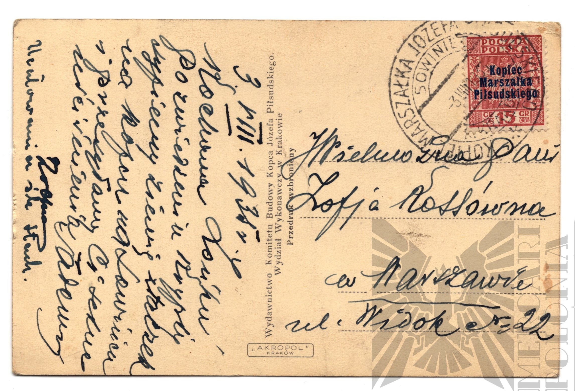 Pocztówka z okresu międzywojennego przedstawiająca projekt Kopca Józefa Piłsudskiego w Krakowie. Pocztówka adresowana do Zofii Kossównej zamieszkałej w Warszawie na ulicy Widok 22 dnia 3 sierpnia 1935 roku.
