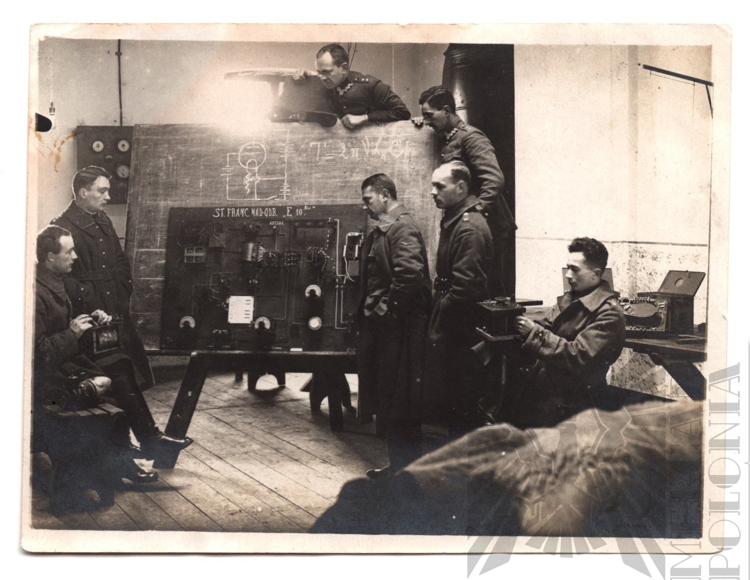 Fotografia ukazująca szkolenie jednostek łączności Wojska Polskiego na stacji nadawczo-odbiorczej. Dobrze widoczne techniczne szczegóły sprzętu oraz umundurowania.