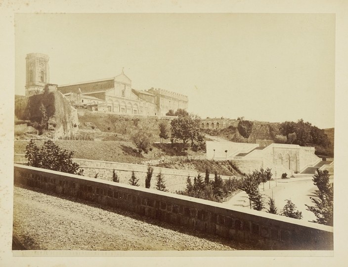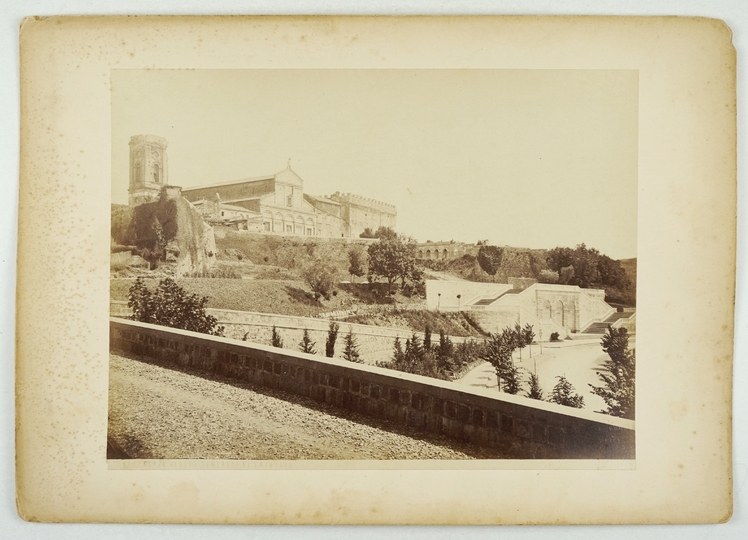 [ITALIA - FLORENCJA - widok zewnętrzny bazyliki San Miniato al Monte - fotografia widokowa]. [l. 70. XIX w.]. Fotografia form. 19,7x25 cm na oryg. podkładzie form. 33x24 cm, autorstwa V[incenzo] Paganoriego we Florencji.