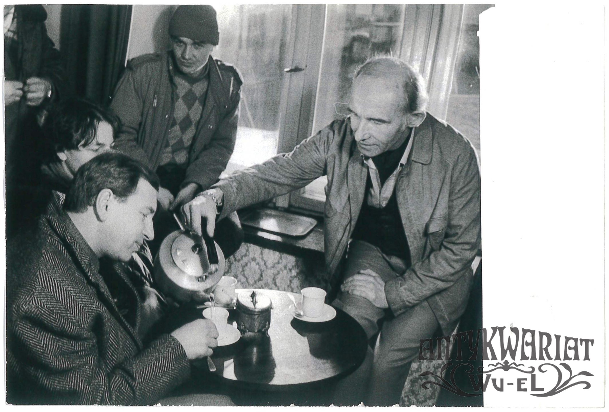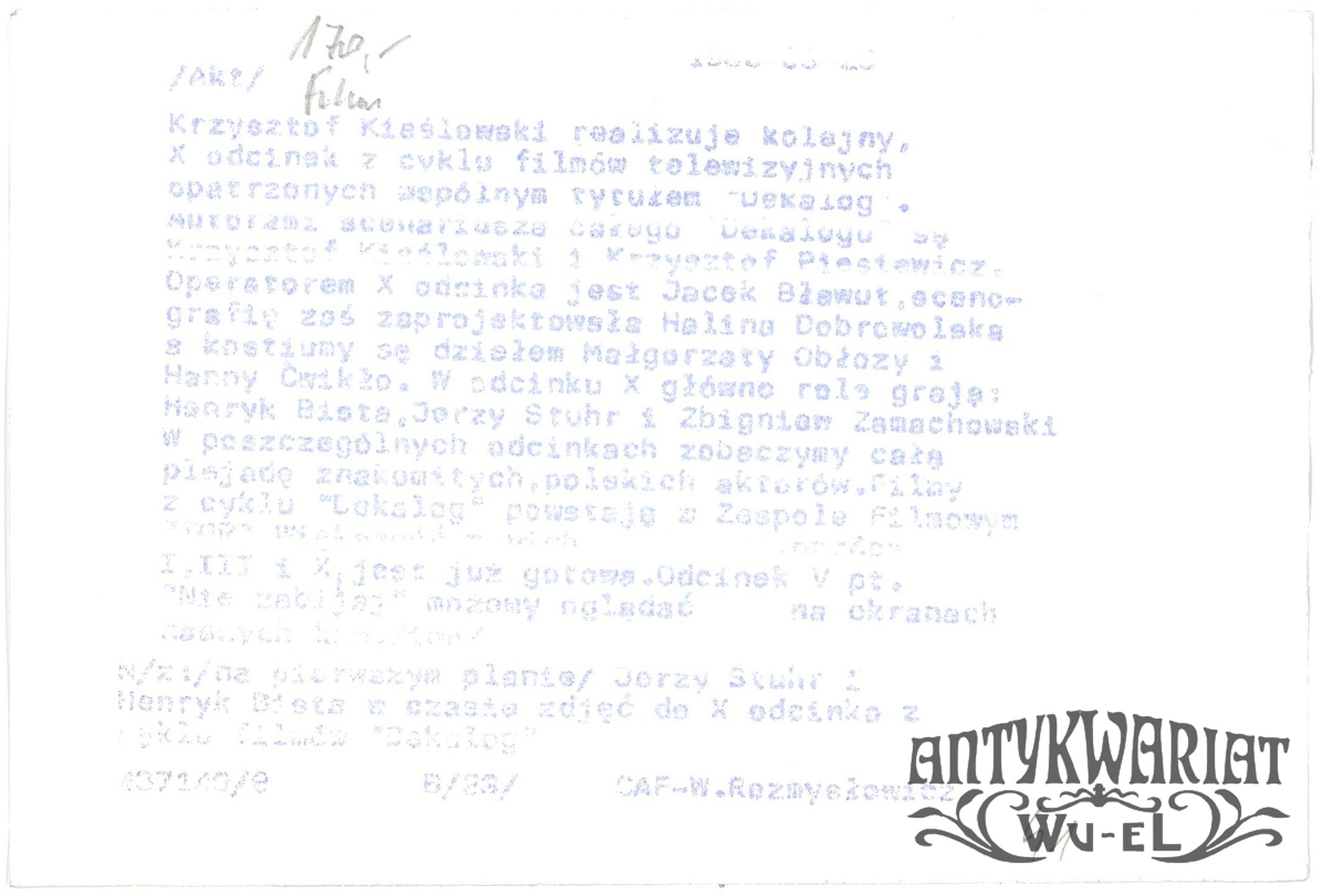 JERZY STUHR i HENRYK BISTA w czasie zdjęć do 10 odcinka filmu "Dekalog" w reż. Krzysztofa Kieślowskiego; fot. CAF - W. Rozmysłowicz, 1988 r.; stan bardzo dobry, wymiary: 17,7 x 11,9 cm