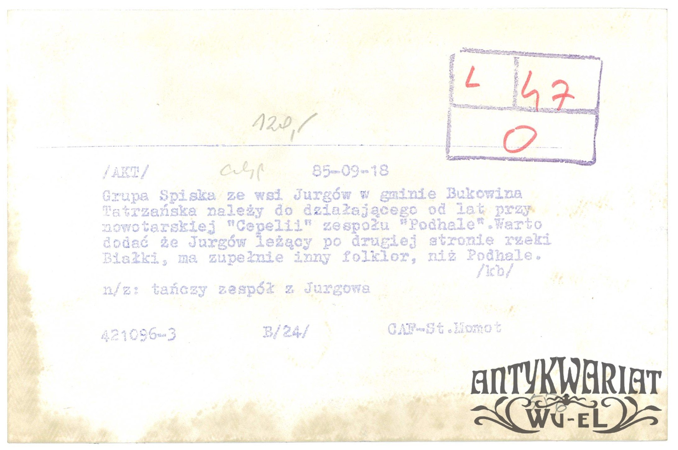 JURGÓW (pow. Tatrzański), ANTAŁÓWKA, ZAKOPANE. Tańczący w plenerze zespół Podhale; fot. St, Momot, 18.09.1985 r.; stan bardzo dobry, wymiary: 18 x 11,8 cm.