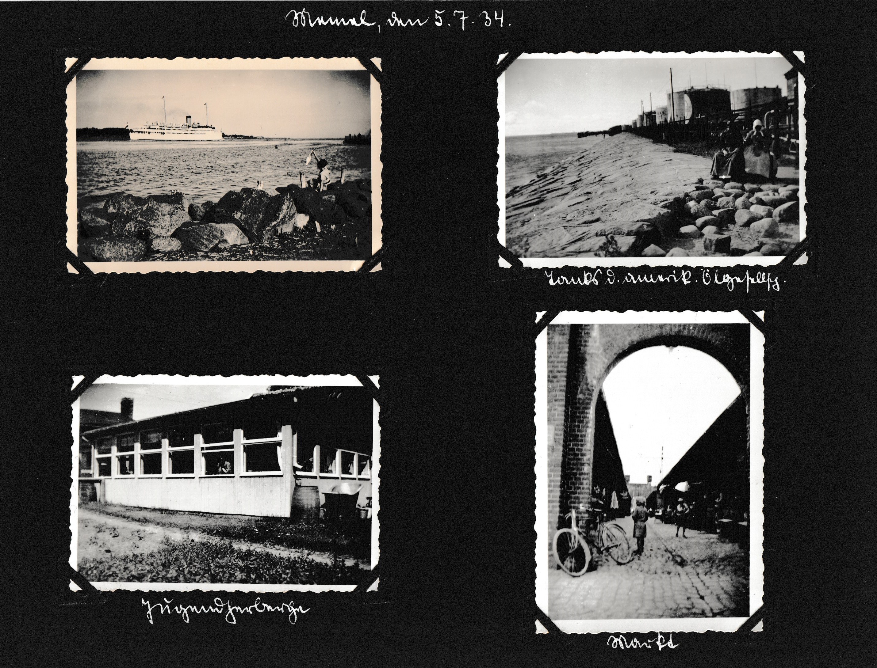 KŁAJPEDA. Zestaw 4 zdjęć przedstawiających widoki nabrzeża i miasta; 5 VII 1934; fot. cz.-b., ząbkowane krawędzie, zdjęcia umieszczone na karcie albumowej; wym. fot.: ok. 88x60 mm;