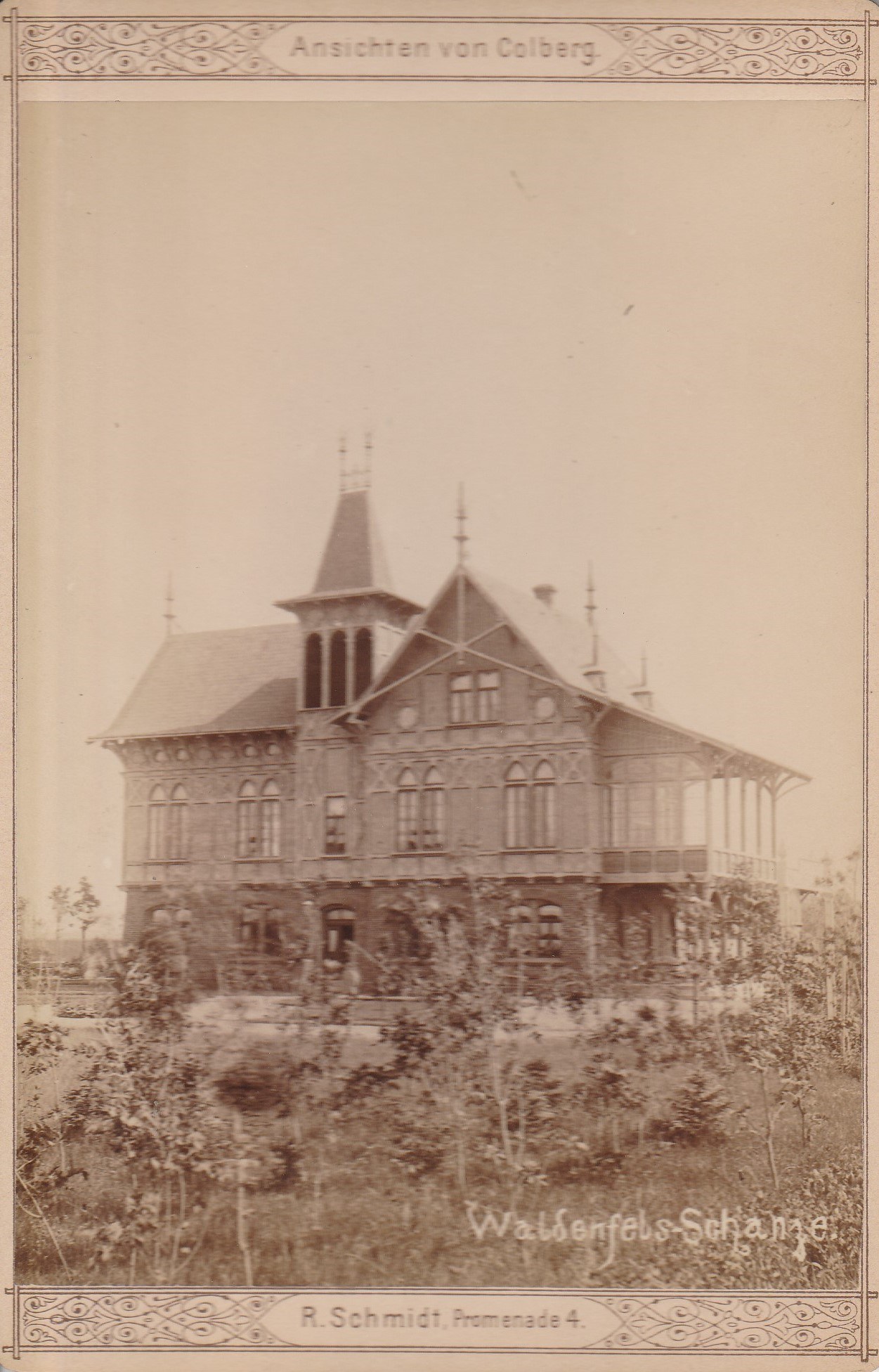 KOŁOBRZEG. Kamienny Szaniec; pochodzi z teki: Ansichten von Colberg, wyd. R. Schmidt, ok. 1900; fot. na firmowym kartonie z ozdobnym ornamentem; fot. w sepii, st. bdb.; wym.: 165x108 mm; Waldenfels-Schanze;