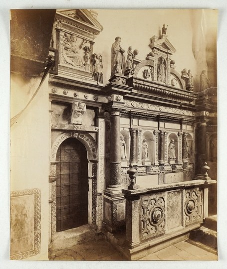 Odbitka ze zdjęcia Ignacego Kriegera z widokiem portalu wejścia do zakrystii i stalli z XVI w. na północnej ścianie prezbiterium. Fotografia reprod. w: E. Gaczoł, A. Kwiatek "Natan Krieger. Wybór fotografii i oprac.", Muz. Histor. m. Krakowa, Kraków 2018, str. 71. Na odwrocie niewielkie ślady wilgoci, podklejone naddarcia marginesów, poza tym stan dobry.