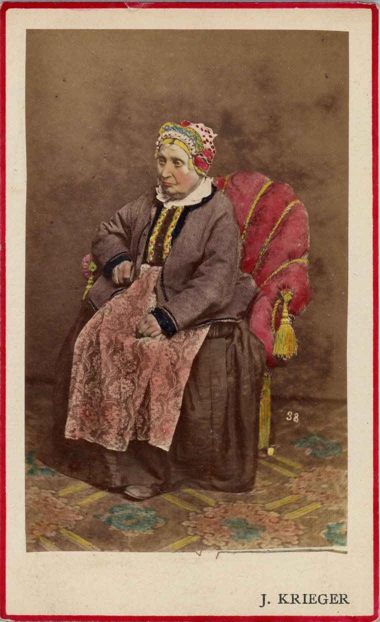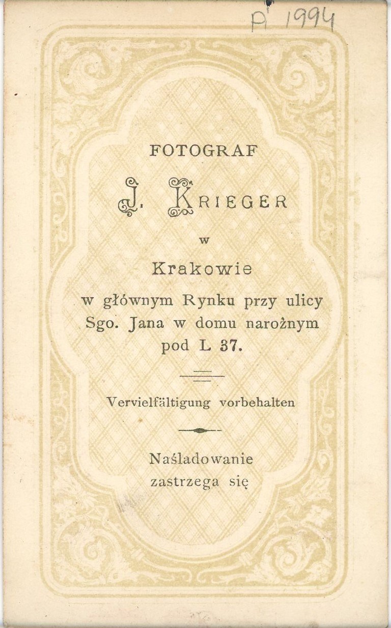 Carte de Visite, wym.: 65 x 105 mm. Stan bardzo dobry. Rzadka winieta z zakł. fot. I. Kriegera, wczesna.