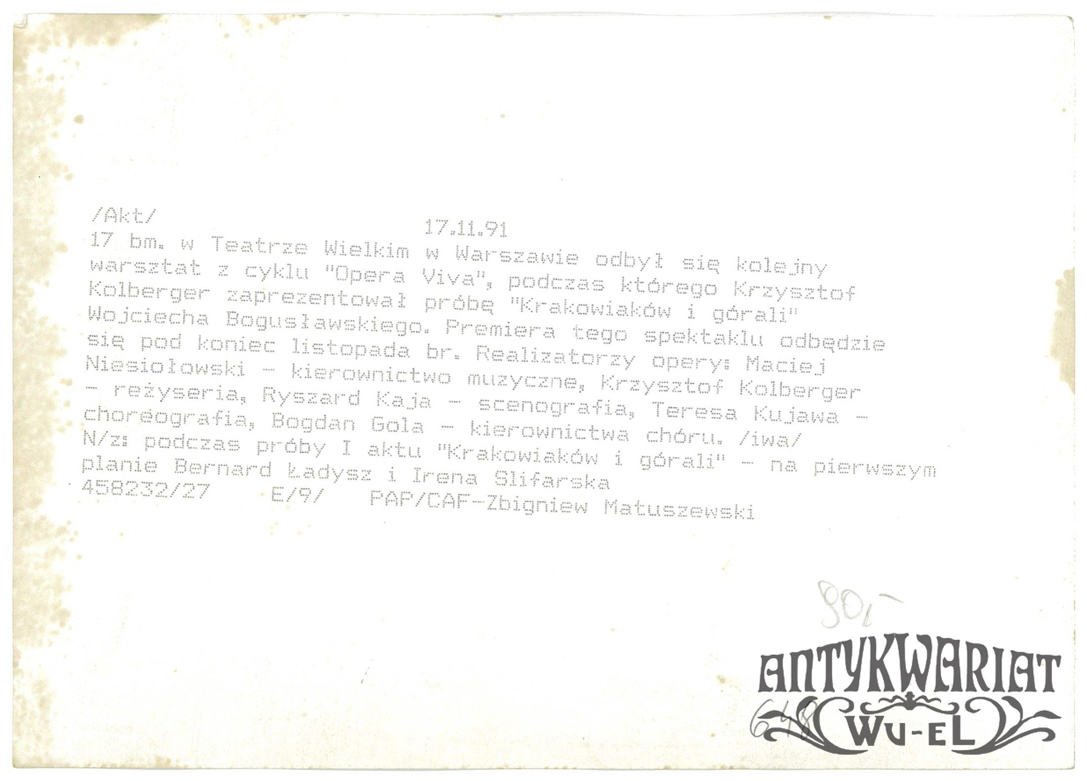 "KRAKOWIACY I GÓRALE". Próba I aktu w Teatrze Wielkim w Warszawie w reż. Krzysztofa Kolbergera, na pierwszym planie: Bernard Ładysz i Irena Ślifarska; fot. PAP/CAF - Zbigniew Matuszewski, 17.11.1991 r.; stan bardzo dobry, wymiary: 18,2 x 12,9 cm.