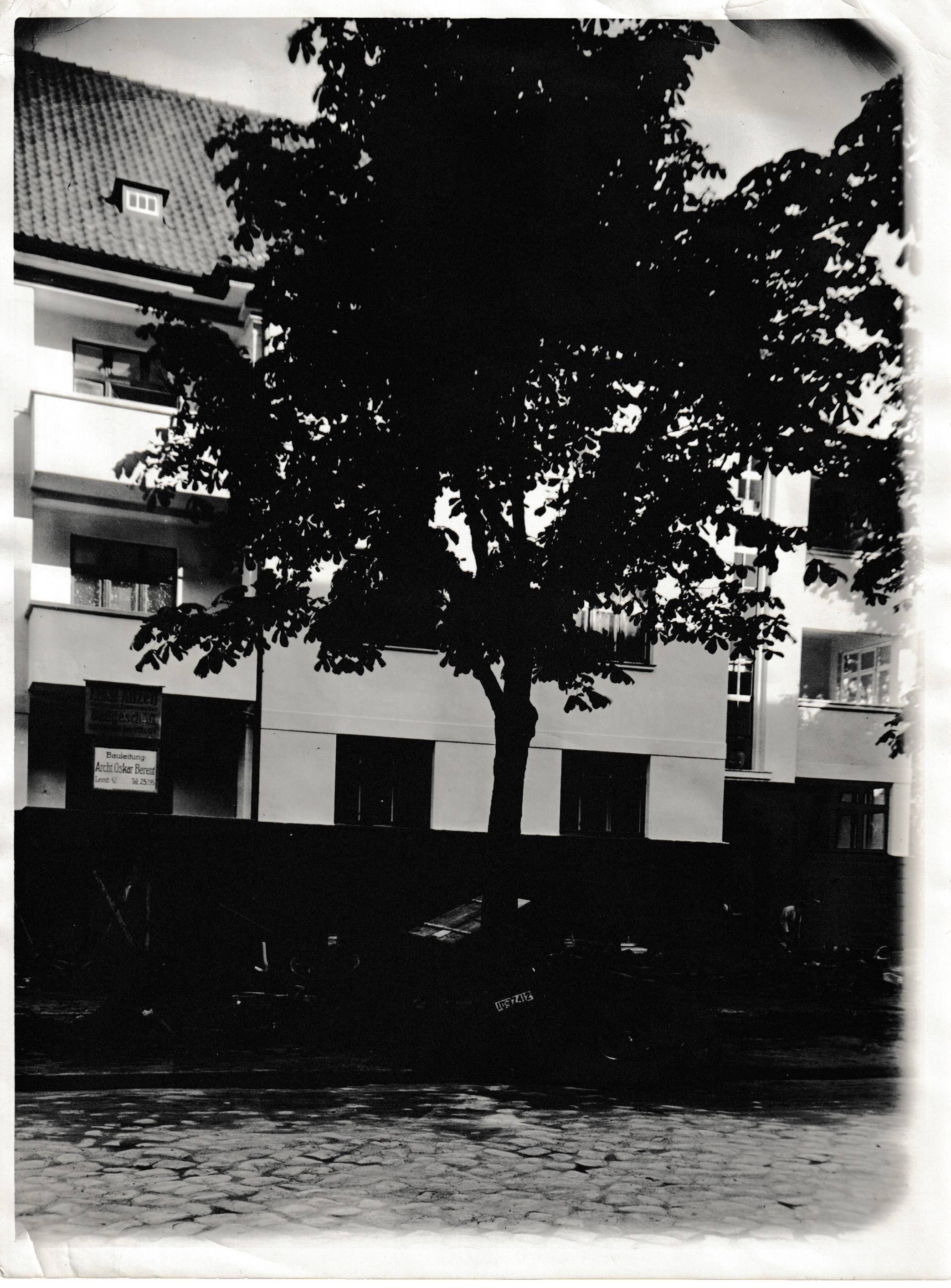 KRÓLEWIEC. Nowy budynek z dołączonym zapisem katastralnym na kalce technicznej; Królewiec, 10 X 1936; hitlerowskie pieczęcie; fot. cz.-b., st. bdb., nieznaczne uszkodzenia krawędzi, na verso ślady klejenia; wym. fot.: 180x240 mm, wym. dokumentu: 227x303 mm;