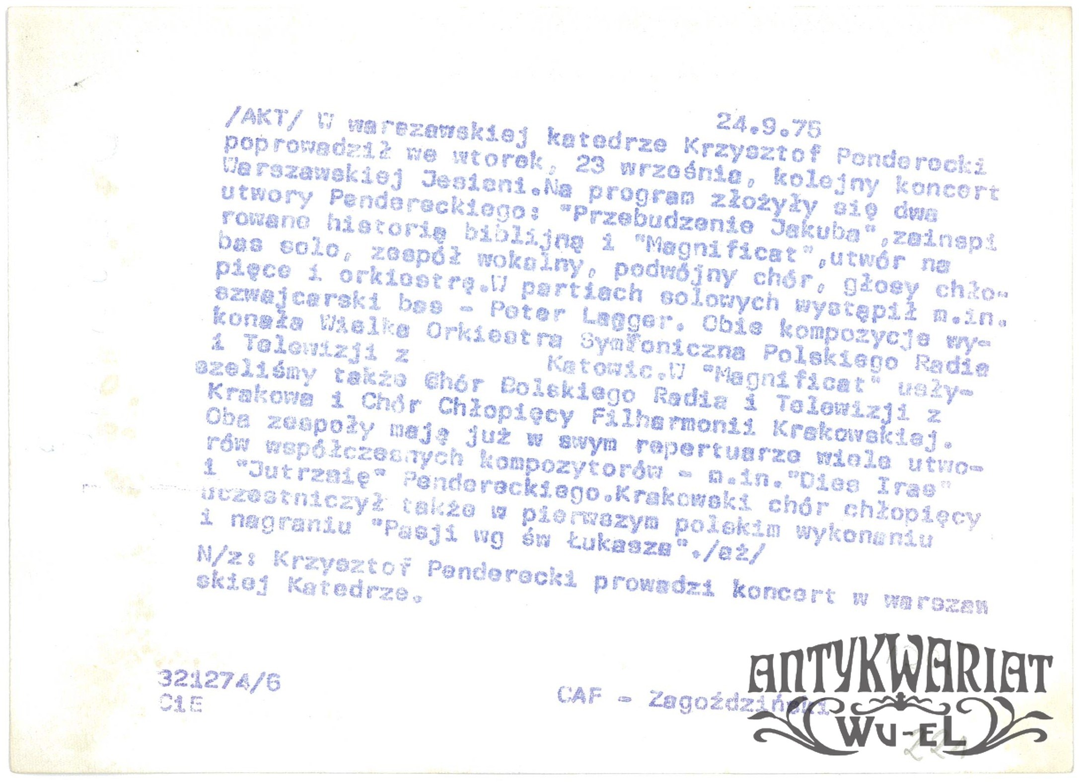KRZYSZTOF PENDERECKI. Koncert Warszawskiej Jesieni w warszawskiej katedrze; fot. CAF - Zagoździński, 24.09.1975 r.; stan bardzo dobry, wymiary: 18,1 x 13 cm.