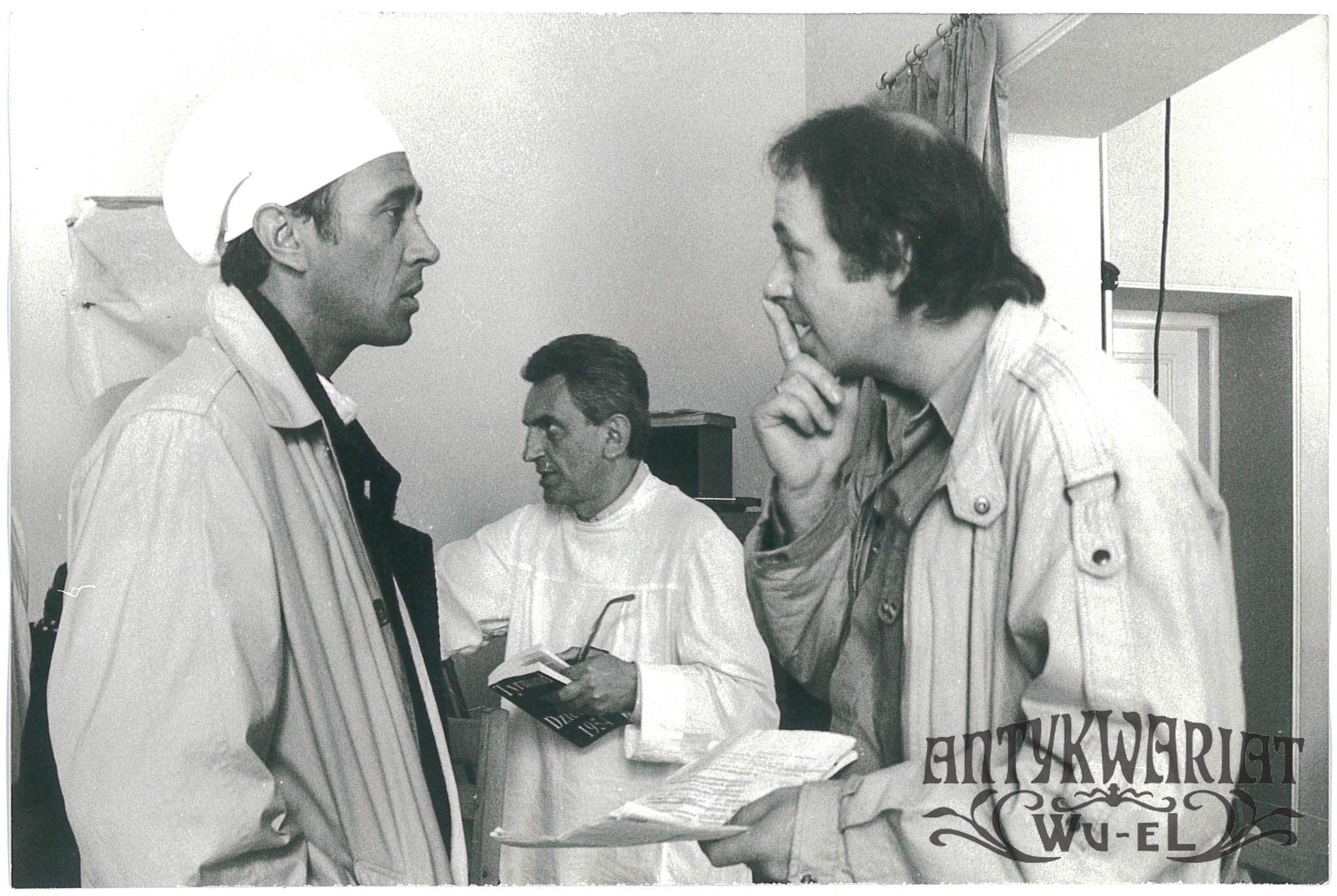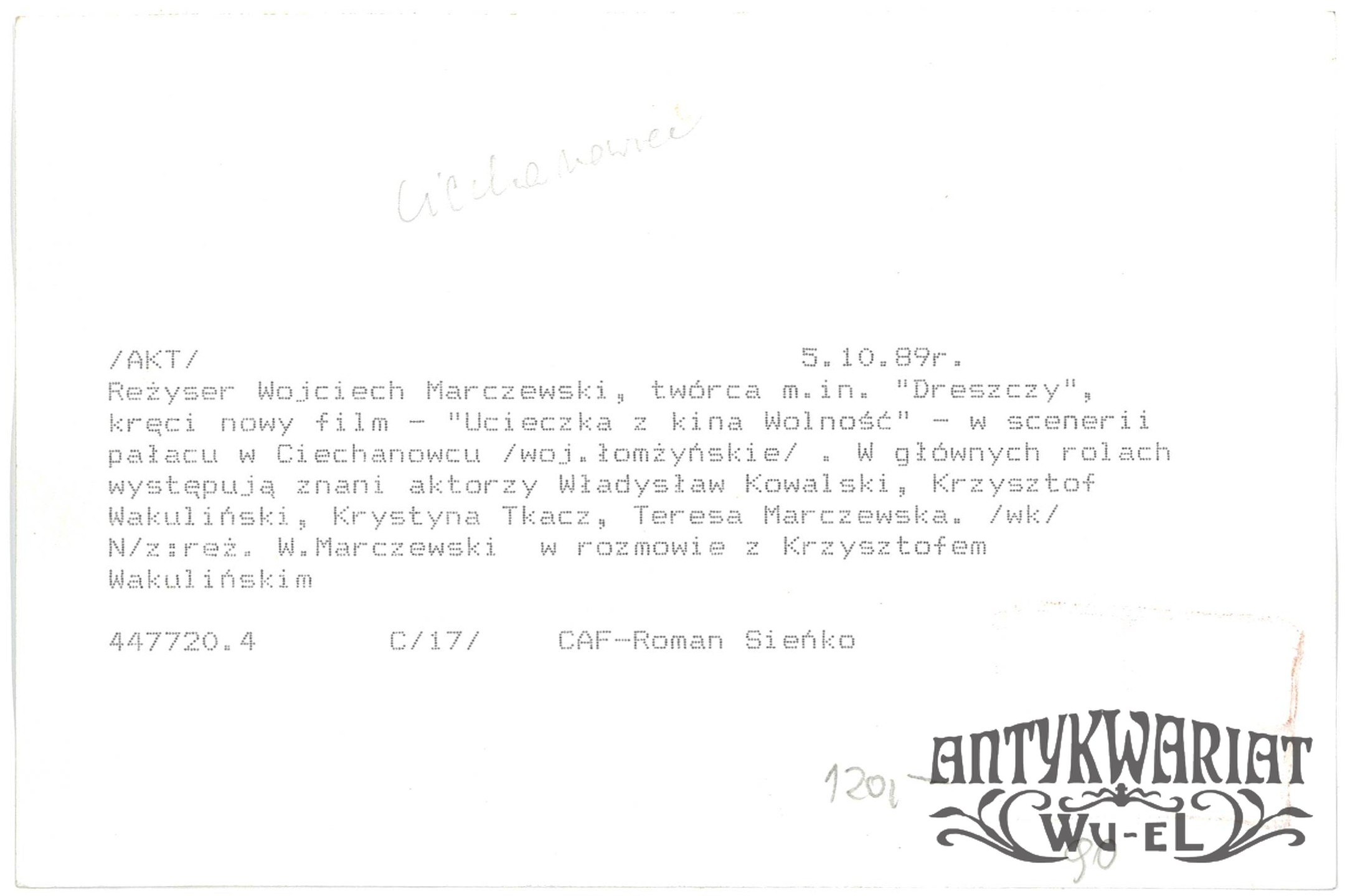 KRZYSZTOF WAKULIŃSKI podczas kręcenia filmu "Ucieczka z kina Wolność" w trakcie rozmowy z reżyserem Wojciechem Marczewskim; fot. CAF - Roman Sieńko, 5.10.1989 r.; stan bardzo dobry, wymiary: 17,9 x 11,8 cm.