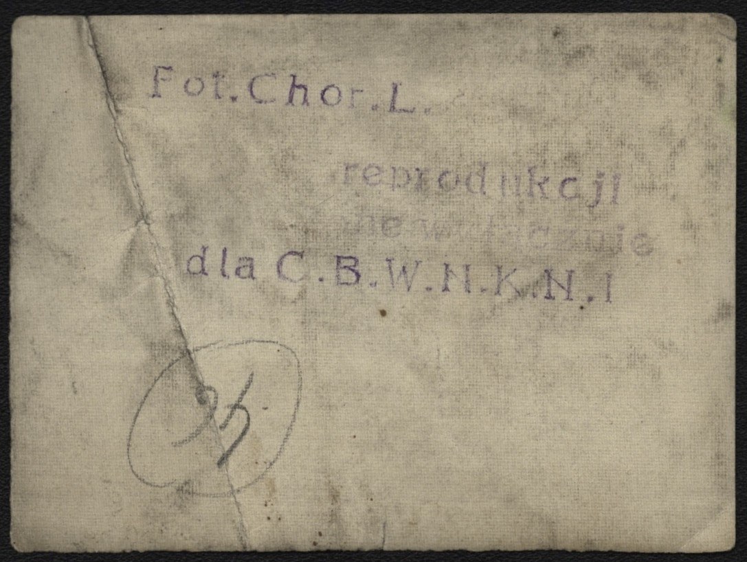 Fotogr. o wym. 6,6 x 9 cm. Zagięcia fotografii. Na rewersie pieczątki.