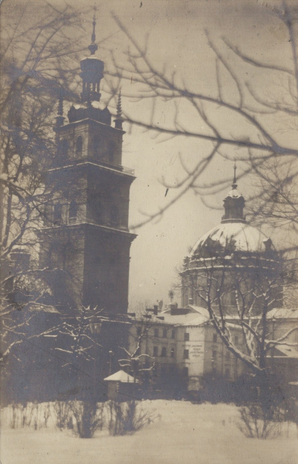 Piękne, zimowe ujęcie dwóch symbolicznych zabytków miasta Lwowa.