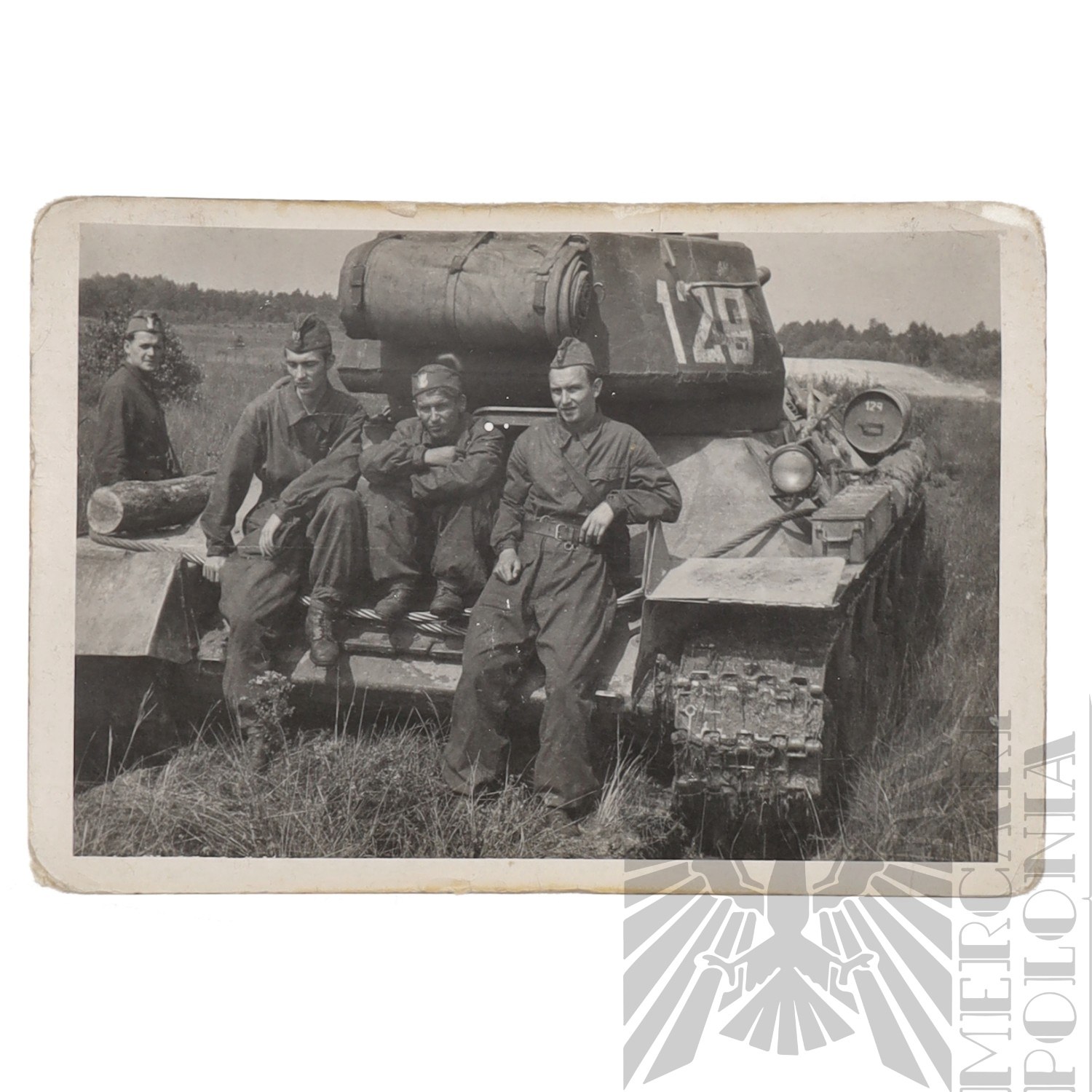 Fotografia przedstawia czołg średni T-34 z widoczną załogą i numerem taktycznym 129. Maszyny tego typu stanowiły podstawowe uzbrojenie polskich jednostek pancernych formowanych w Związku Radzieckim podczas II wojny światowej. Numer i malowanie mogą wskazywać na przynależność pojazdu do 1. Warszawskiej Brygady Pancernej im. Bohaterów Westerplatte.