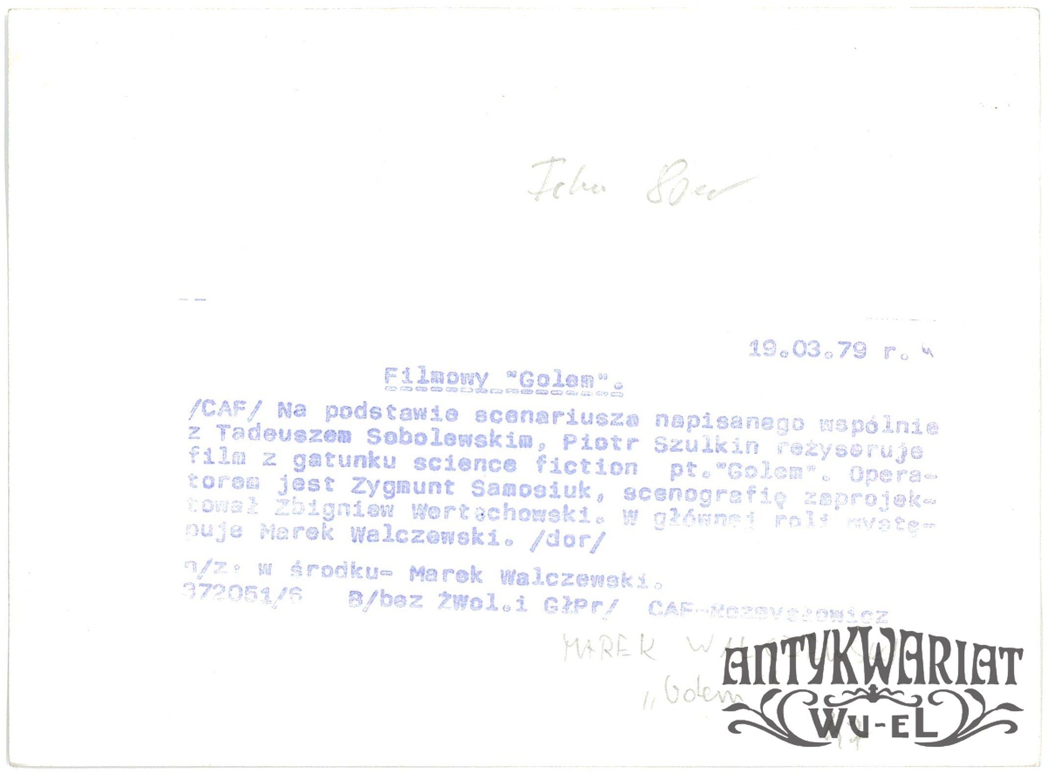 MAREK WALCZEWSKI na planie filmu "Golem", w którym grał główną rolę; fot. CAF - Rozmysłowicz, 1979 r.; stan bardzo dobry, wymiary: 17,8 x 13,1 cm.