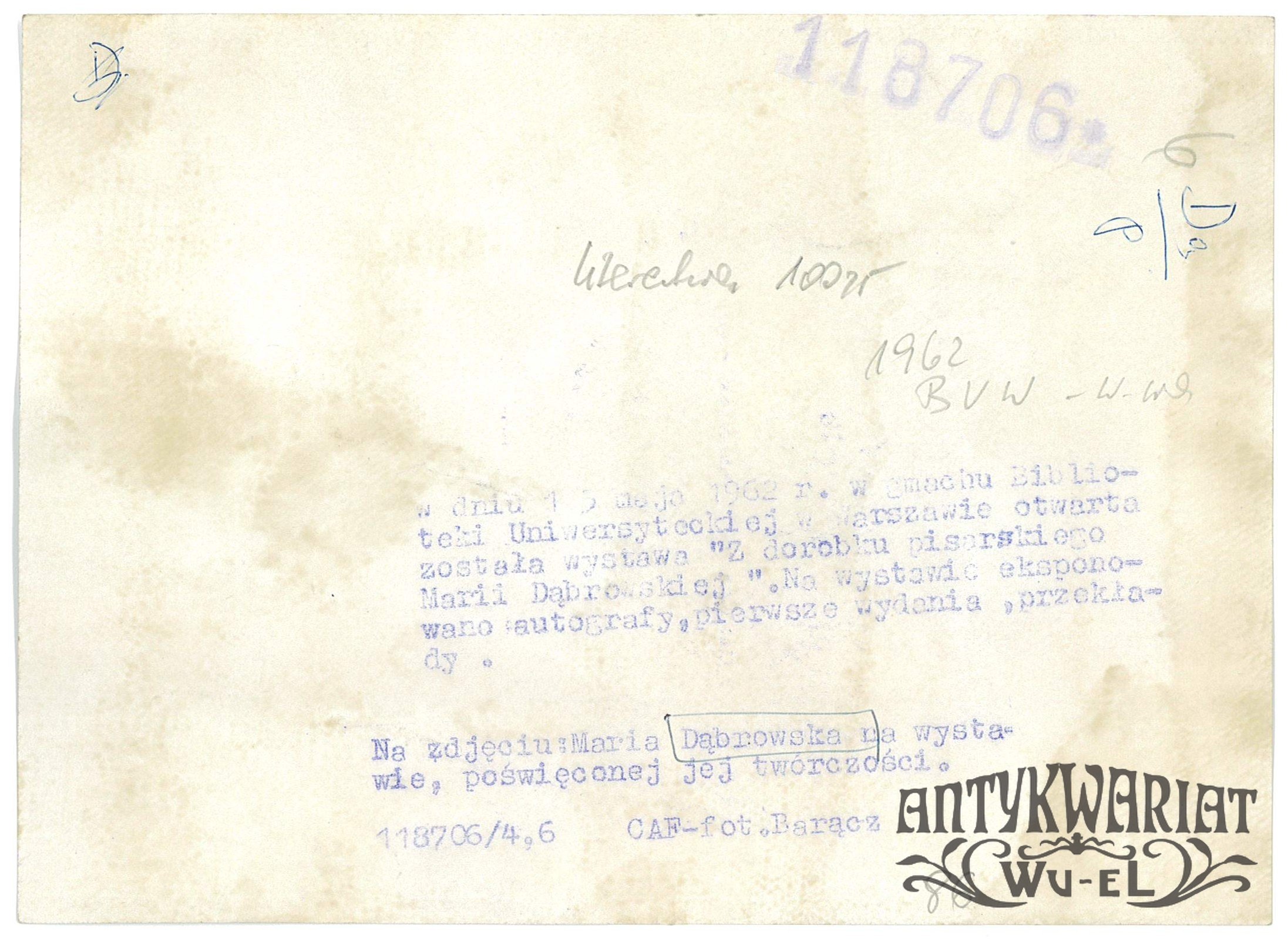 MARIA DĄBROWSKA w Bibliotece Uniwersytetu Warszawskiego na wystawie poświęconej swojej twórzości; fot. CAF - Barącz, 15.05.1962 r.; stan bardzo dobry, wymiary: 18 x 13,1 cm