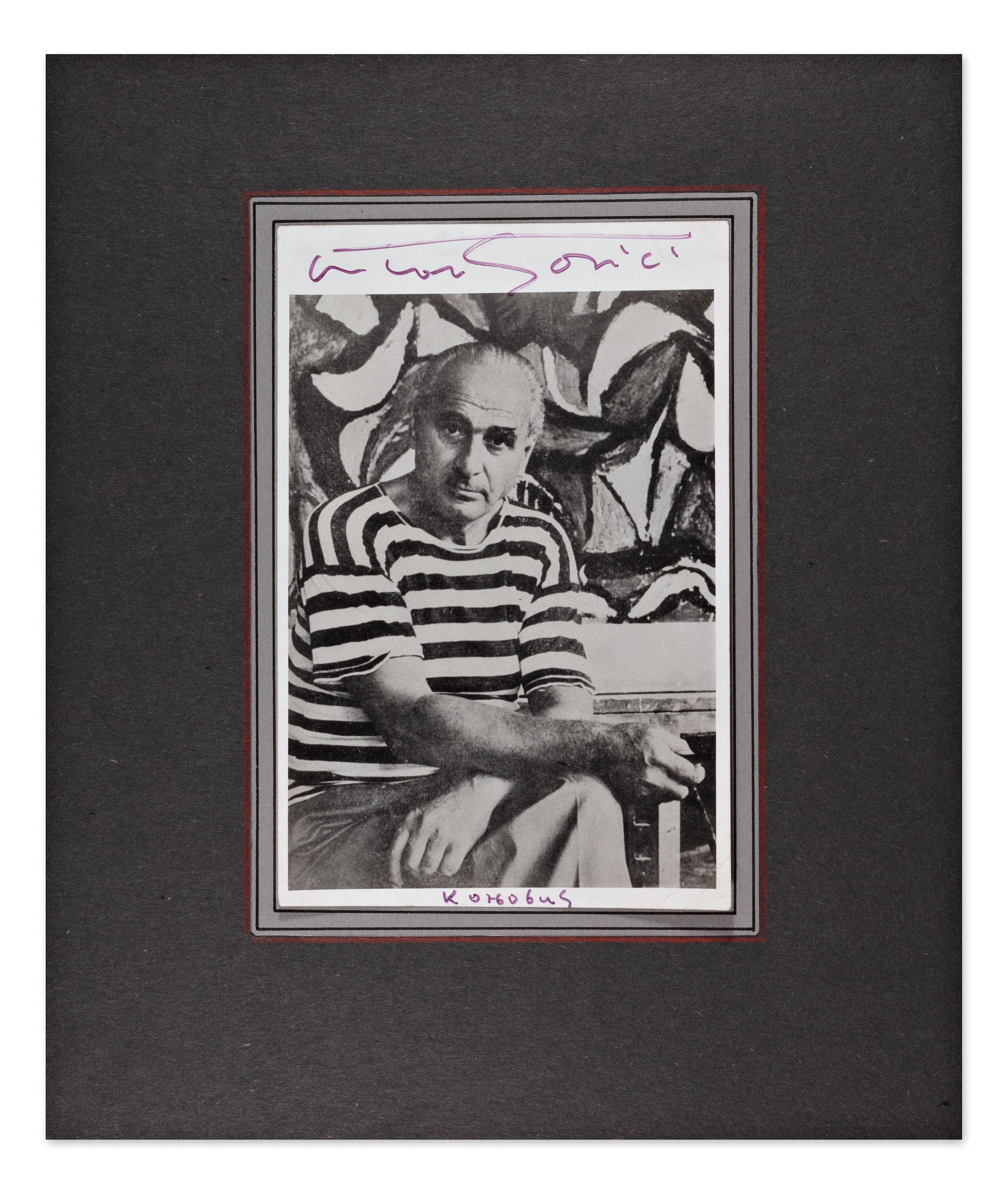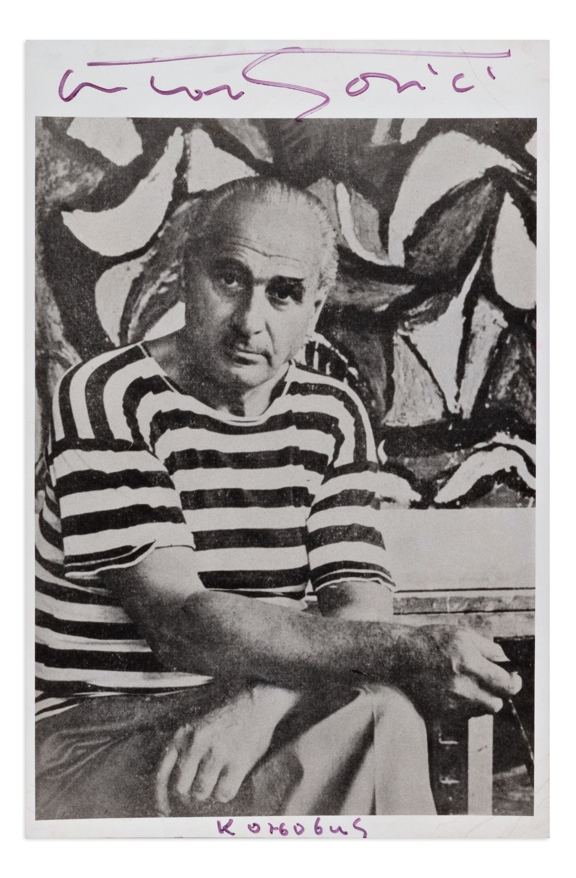 Black-and-white portrait photograph with a handwritten signature in purple ink by the Serbian painter Milan Konjović.Milan Konjović was a prominent Serbian expressionist painter, whose work spanned a wide range of styles from Impressionism to abstraction. He was one of the most important artists of Yugoslav modernism, and his works are part of many prestigious collections. Konjović was known for his distinctive use of color, dynamic compositions, and strong emotional expression in his paintings.