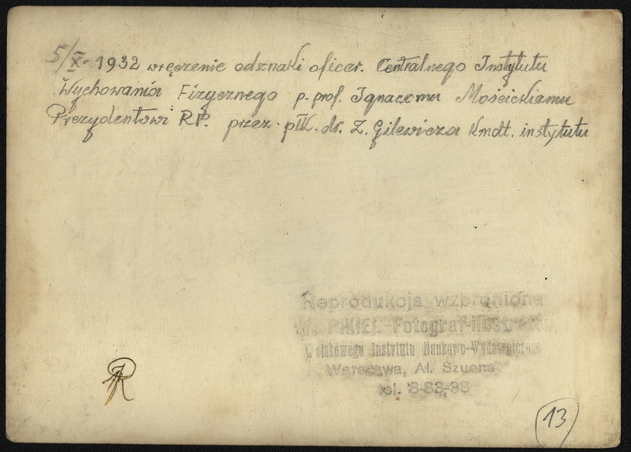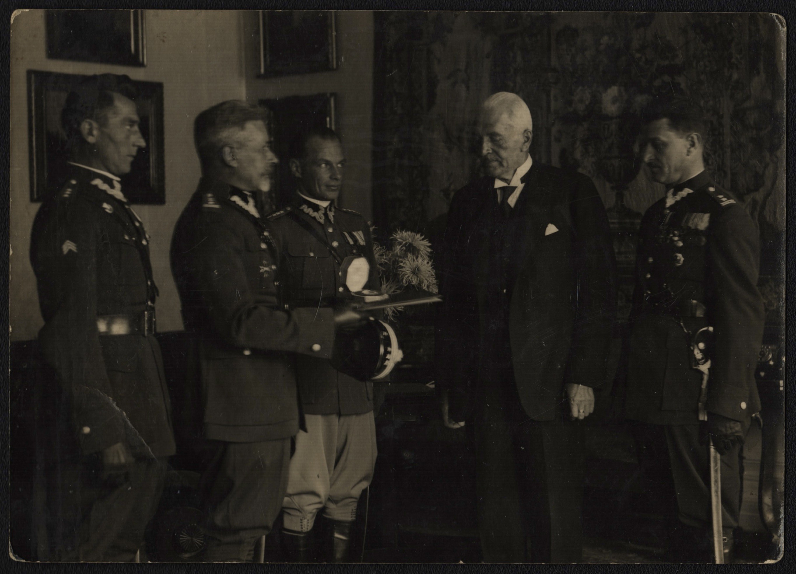 Wręczenie prezydentowi RP Ignacemu Mościckiemu odznaki instruktorskiej przez delegację Centralnego Instytutu Wychowania Fizycznego. Widoczni m.in. kapitan Suszkiewicz, pułkownik Zygmunt Gilewicz, kapitan Lubicz-Nycz, podpułkownik Krzyski. [opis za NAC]