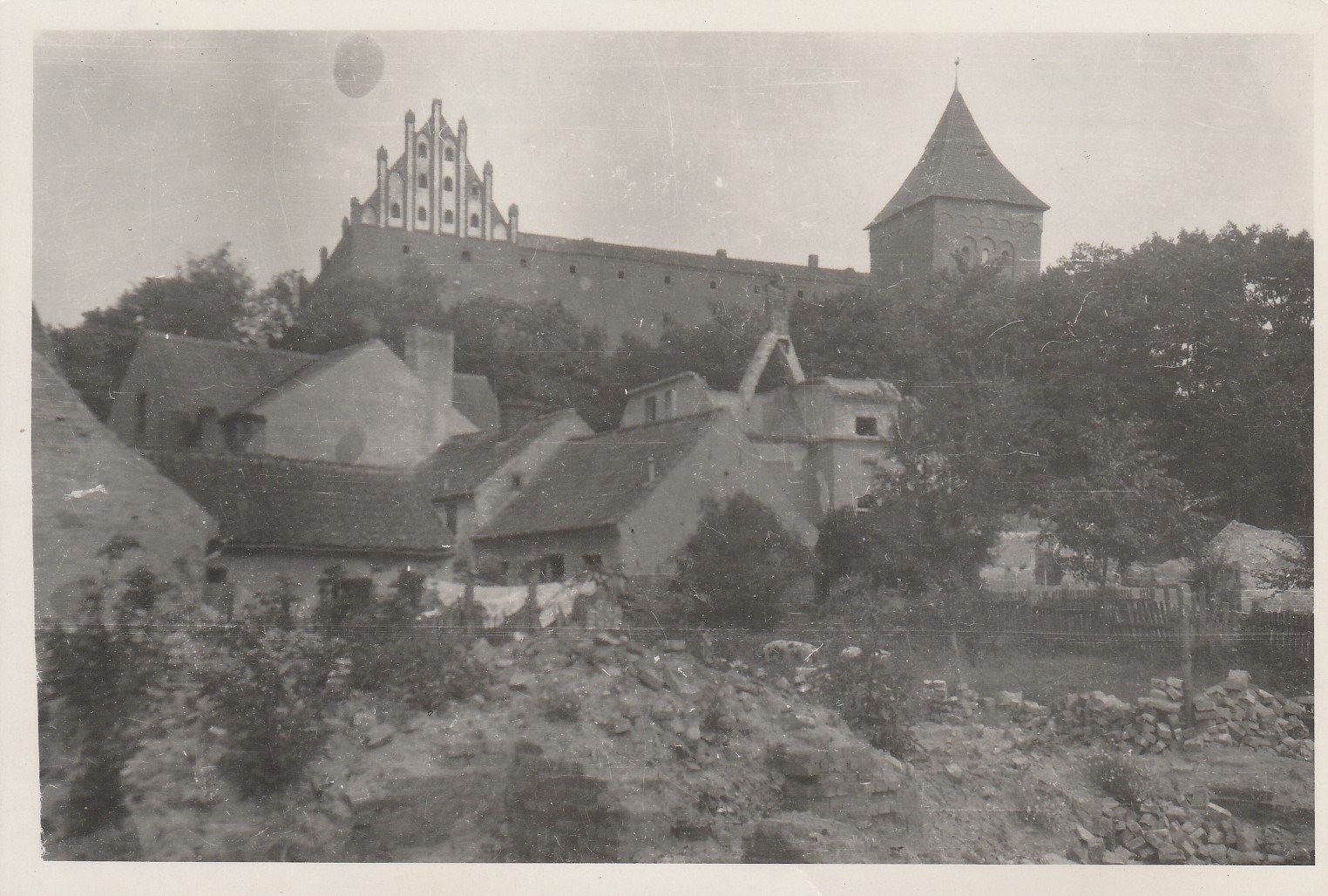 NIDZICA. Zamek, widok ogólny; fot. inż. arch. Józef Fischer, IX 1950; na verso pieczęć autora i odręczny opis; fot. cz.-b., st. bdb., niewielkie rozdarcie dolnej krawędzi; wym.: 130x89 mm;