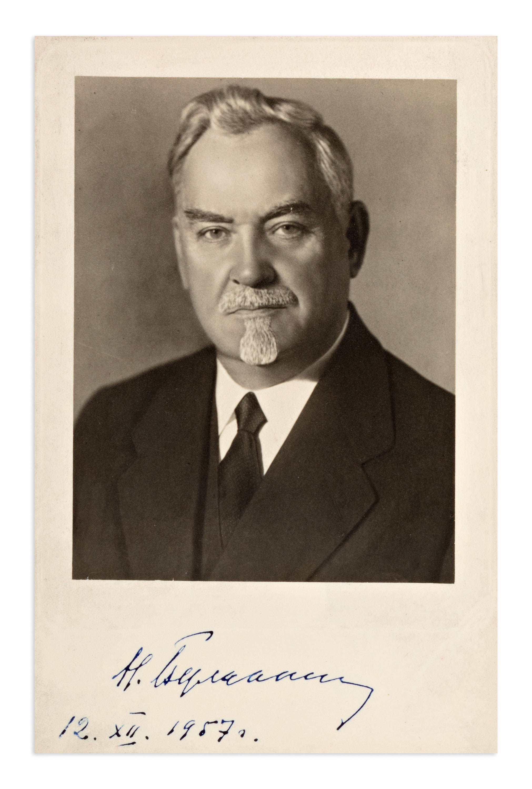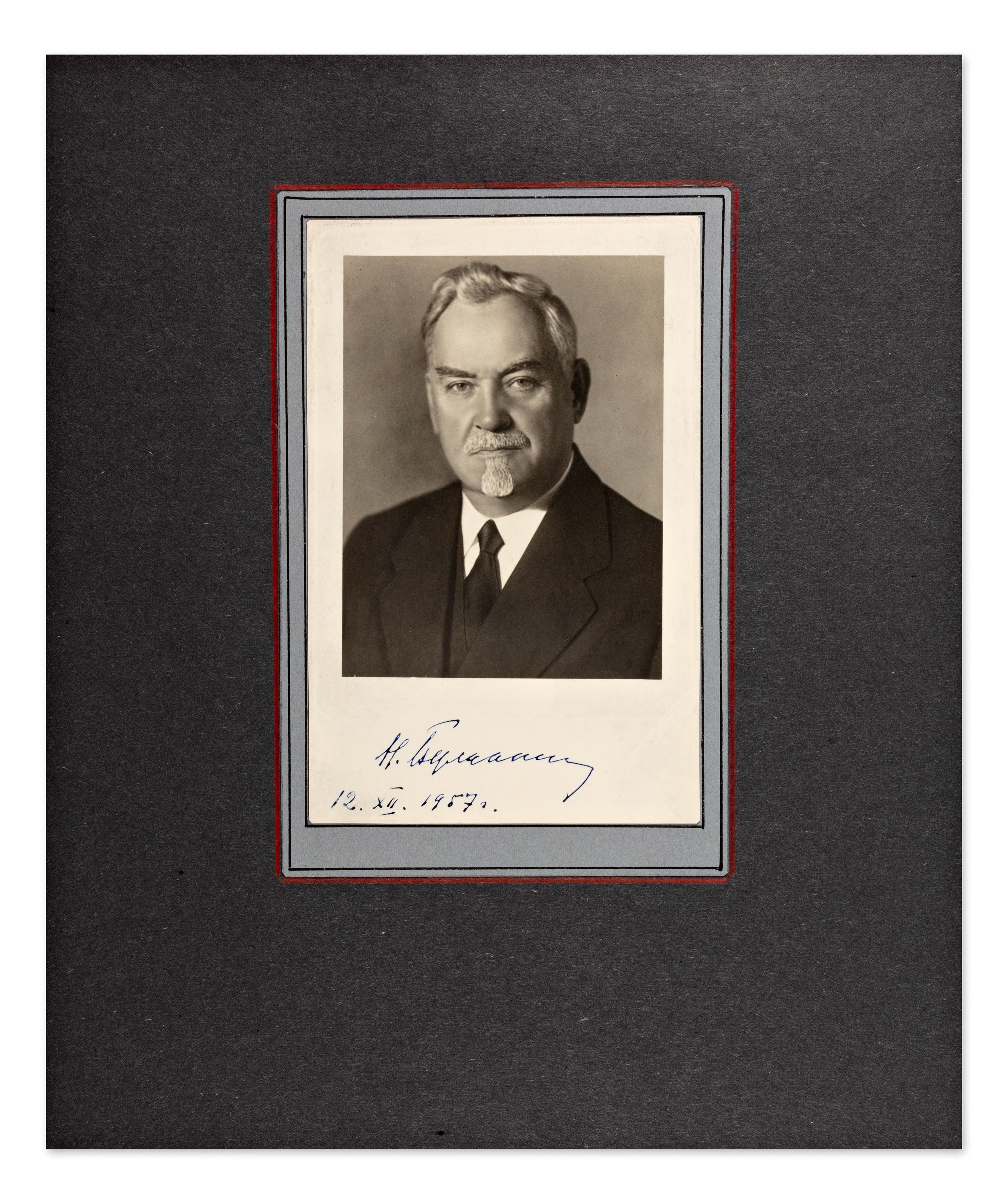 Original photograph with the handwritten signature of Nikolai Bulganin, Soviet politician and statesman who served as Chairman of the Council of Ministers of the USSR from 1955 to 1958.