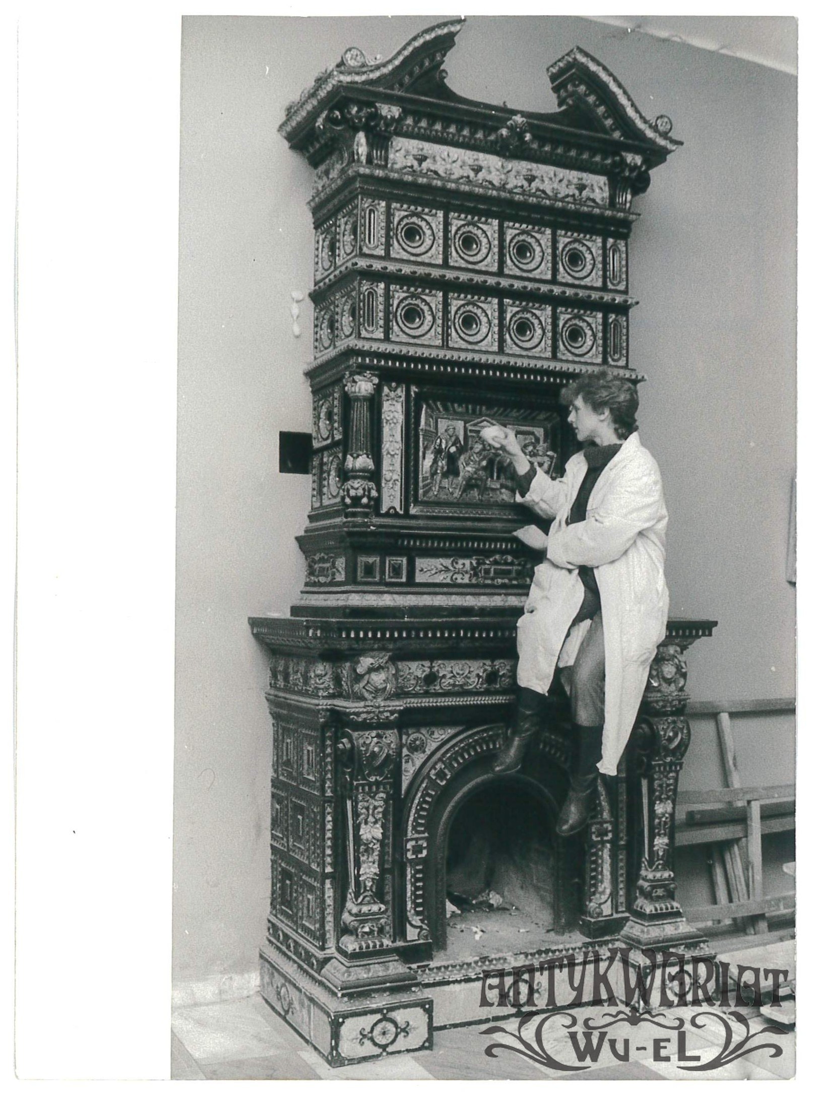 NOWOGRÓD (pow. Łomża), prace przy zabytkowym kominku, fot. CAF, 1986