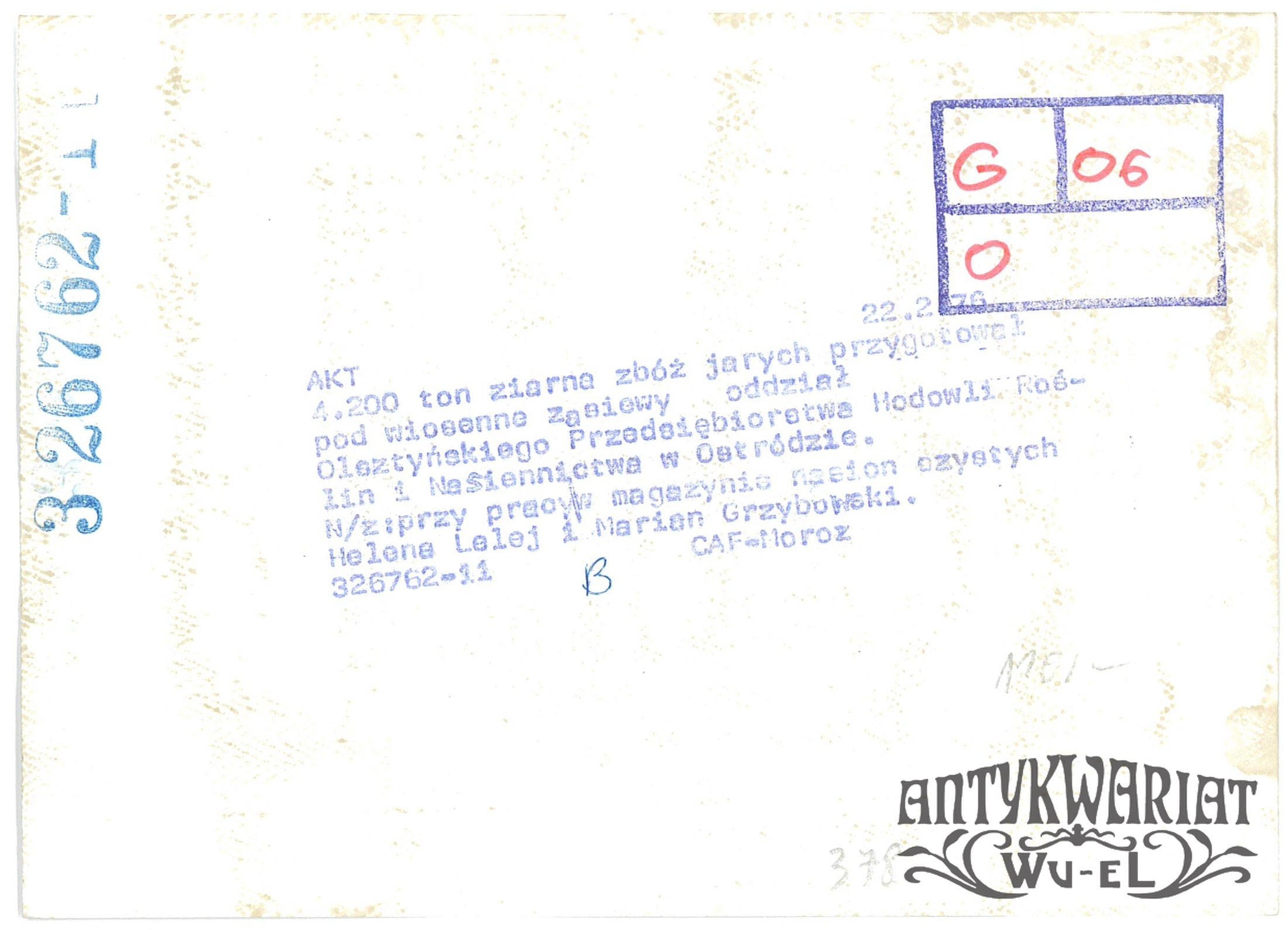 OSTRÓDA. Przedsiębiorstwo Hodowli Roślin i Nasiennictwa, magazyn nasion czystych, przy pracy Helena Lelej i Marian Grzybowski; fot. CAF - Moroz, 22.02.1976 r.; stan bardzo dobry minus, wymiary: 18,2 x 13 cm.