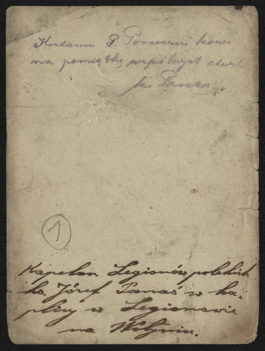 Na rewersie dedykacja ks. Józefa Panasia (1887-1940), kapelana i dziekana Legionów Polskich, dla niewymienionego z nazwiska porucznika "na pamiątkę wspólnych chwil". Ponadto poniżej opis (piórem) miejsca wykonania fotografii.