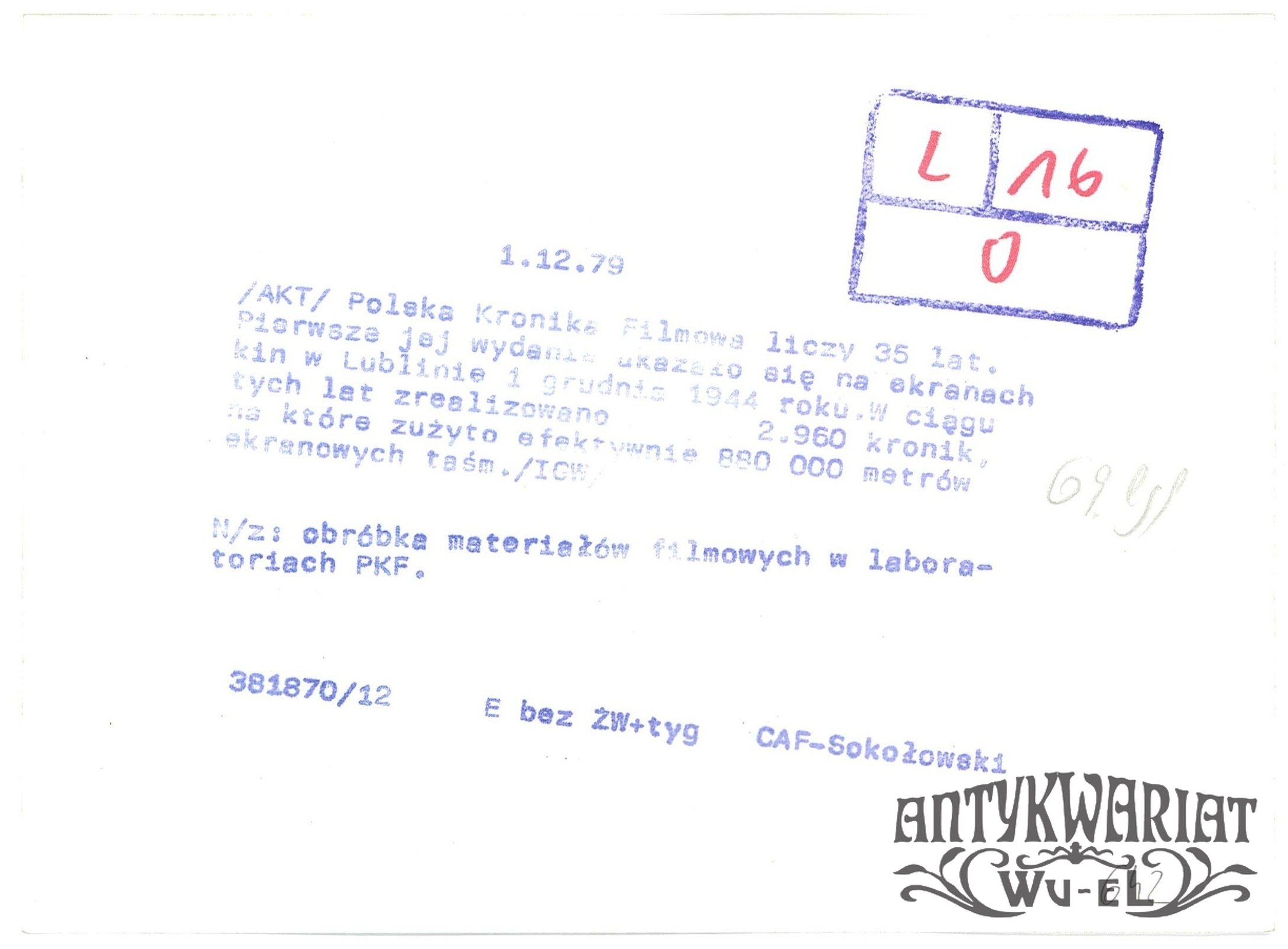 POLSKA KRONIKA FILMOWA ma 35 lat, obróbka materiałów filmowych w laboratoriach PKF. Fot. CAF - Sokołowski, 1.12.1979 r.; stan bardzo dobry minus, wymiary:17,9 x 13,1 cm.