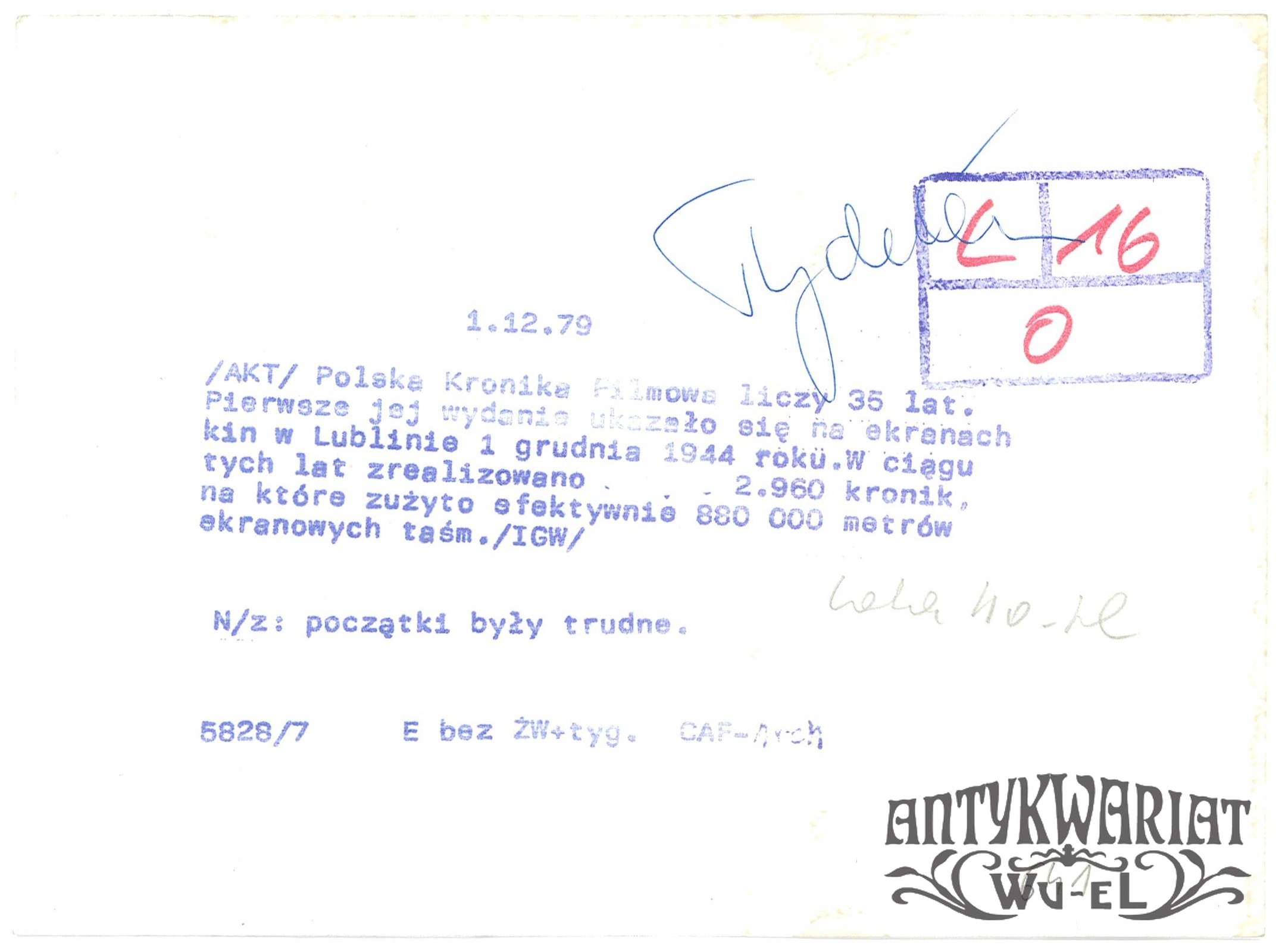 POLSKA KRONIKA FILMOWA. Trudne początki w latach 40., zdjęcie pt. "Polska Kronika Filmowa ma 35 lat"; fot. CAF - arch., 1979 r.; stan bardzo dobry, wymiary: 17,8 x 13 cm.