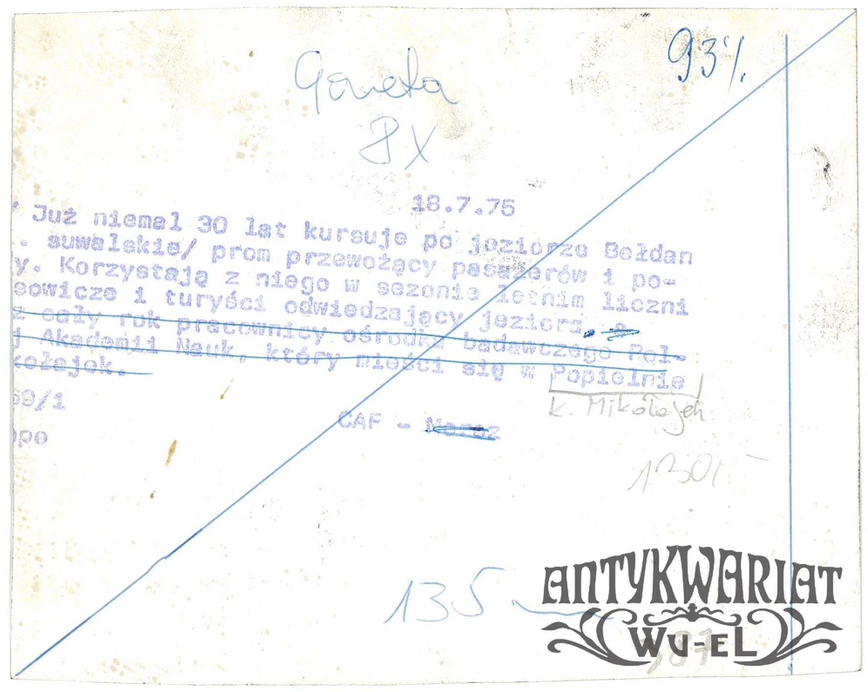 POPIELNO (pow. Pisz). Prom na jeziorze Bełdany; fot. CAF - Moroz, 18.07.1975 r.; stan bardzo dobry minus, wymiary: 14,6 x 11,7 cm.