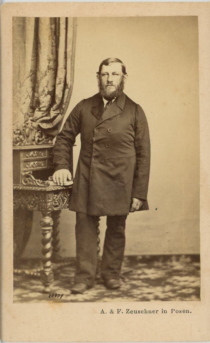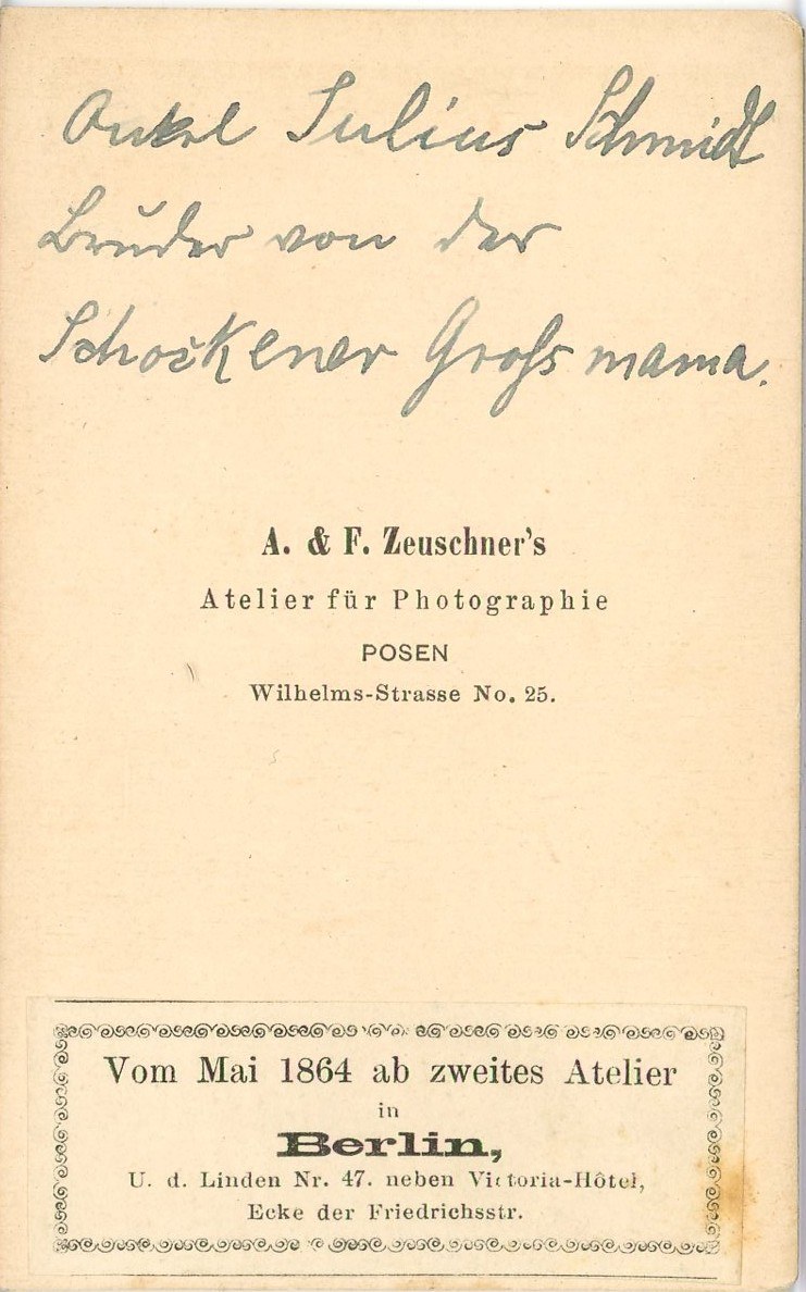 Carte de Visite, wym.: 63 x 102 mm. Stan bardzo dobry. Bardzo rzadka nalepka informująca o otworzeniu nowego zakł. fot. w Berlinie.