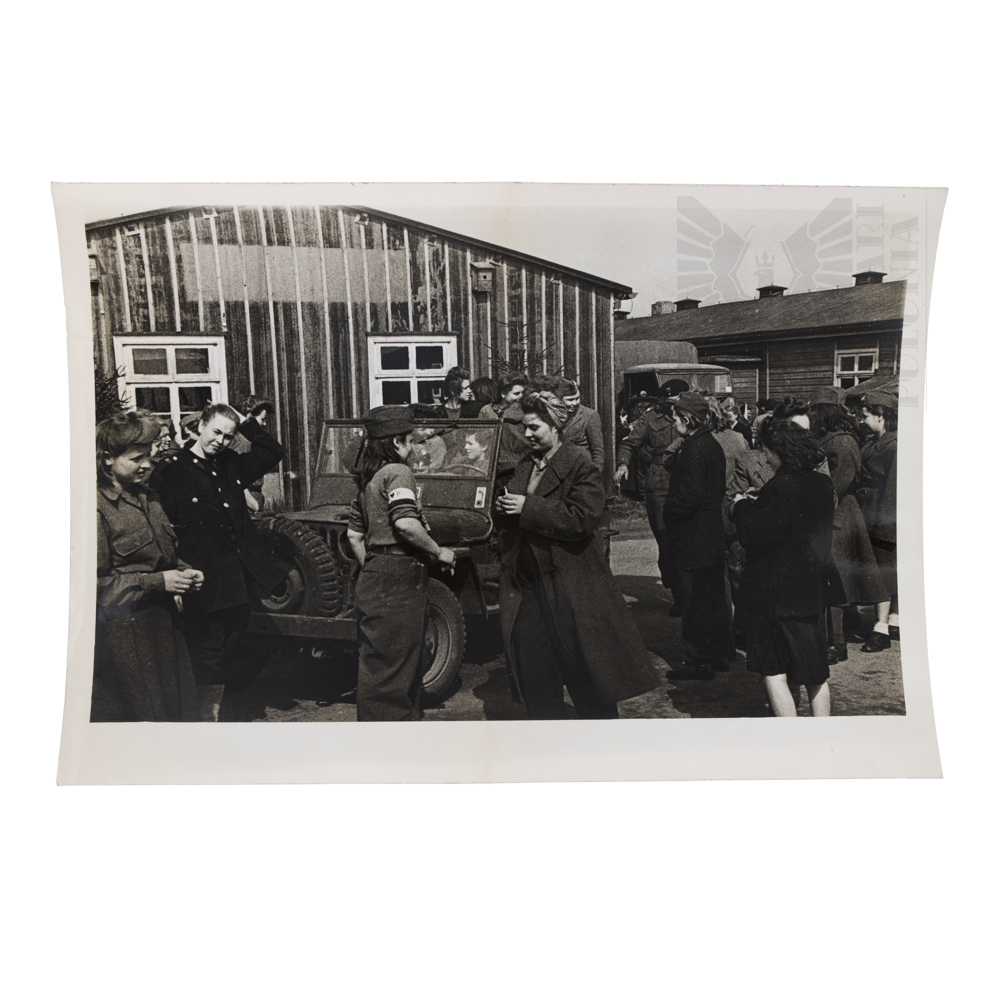 Oswobodzone z niemieckiego obozu jenieckiego uczestniczki powstania warszawskiego w towarzystwie żołnierzy 2. Pułku Pancernego z 1 Dywizji Pancernej gen. Stanisława Maczka. Między barakami stoją samochody transportowe. Na uwagę zwraca mieszanka umundurowania brytyjskiego oraz ubrań cywilnych i umundurowania z okresu walk powstańczych.