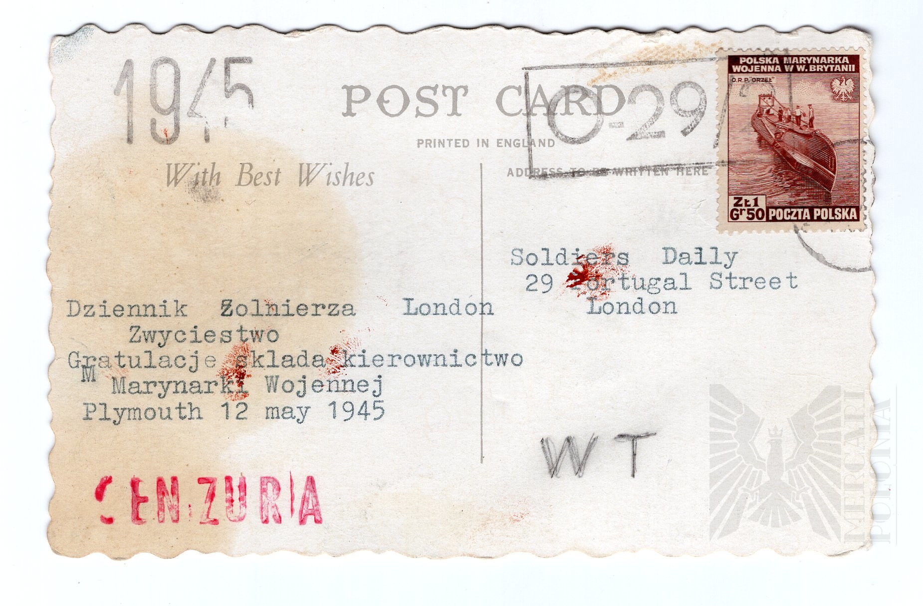 Pocztówka polskiej Marynarki Wojennej z okresu II wojny światowej, wydrukowana w Anglii. Na awersie nadruk „POST CARD 29 – PRINTED IN ENGLAND – With Best Wishes – ADDRESS TO WHEN HERE”. Na karcie widnieje znaczek „POLSKA MARYNARKA WOJENNA W W. BRYTANII” oraz „O.R.P. ORZEL”. Zastosowano stempel polskiej poczty wojskowej „Gr 50 POCZTA POLSKA”. Widoczny jest również odcisk adresowy „Soldiers Daily, 29 Portugal Street, London – Dziennik Żołnierza, London”. Tekst gratulacyjny brzmi: „Zwycięstwo – gratulacje składa kierownictwo M. Marynarki Wojennej, Plymouth, 12 May 1945”. Na pocztówce znajdują się także oznaczenia „WT” oraz stempel cenzury wojskowej „CENZURA”.
