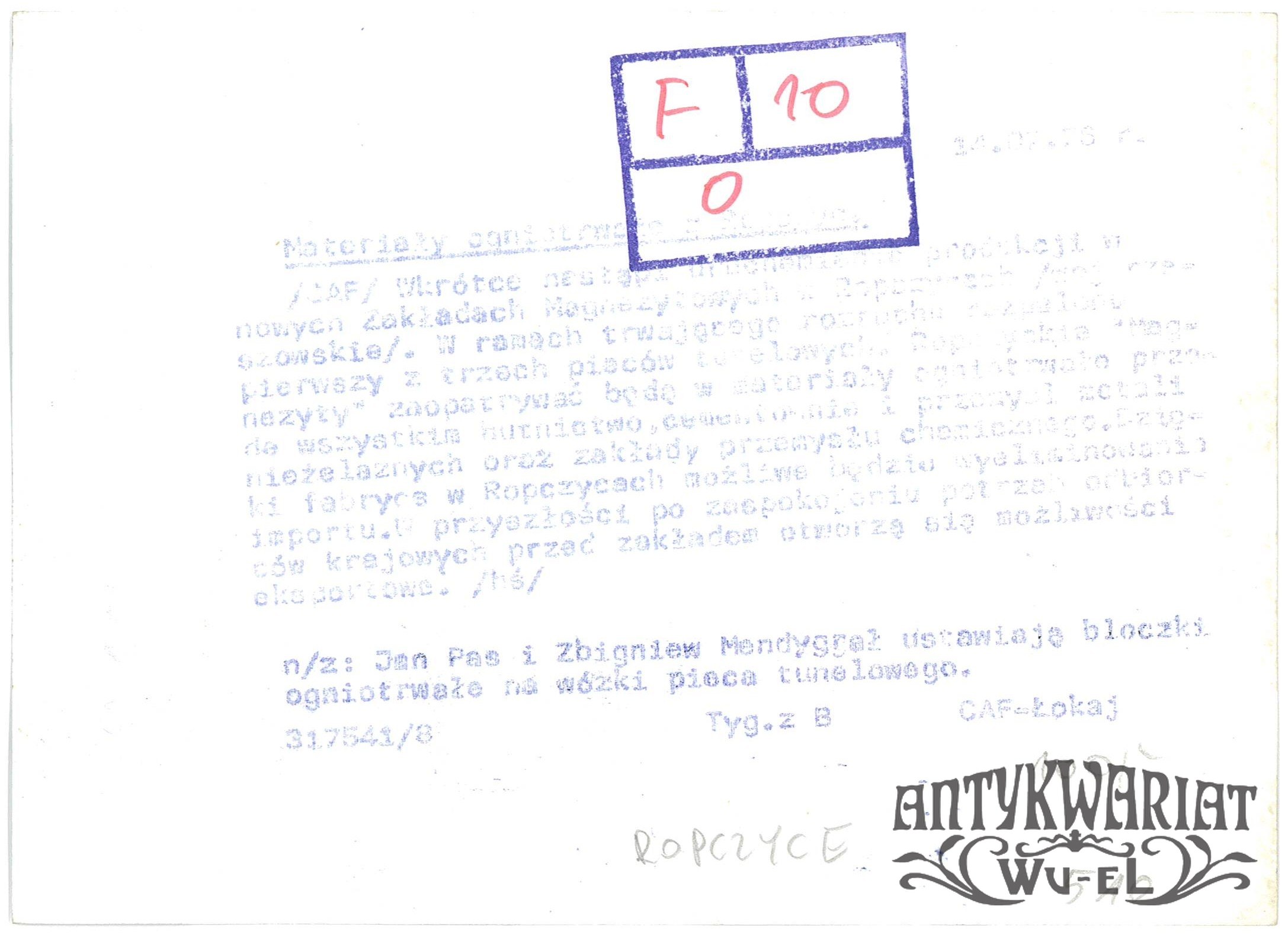 ROPCZYCE. Zakłady Magnezytowe, praca przy ustawianiu ogniotrwałych bloczków na wózki pieca tunelowego; fot. CAF - Łokaj, 14.07.1975 r.; stan bardzo dobry, wymiary: 18 x 13 cm.