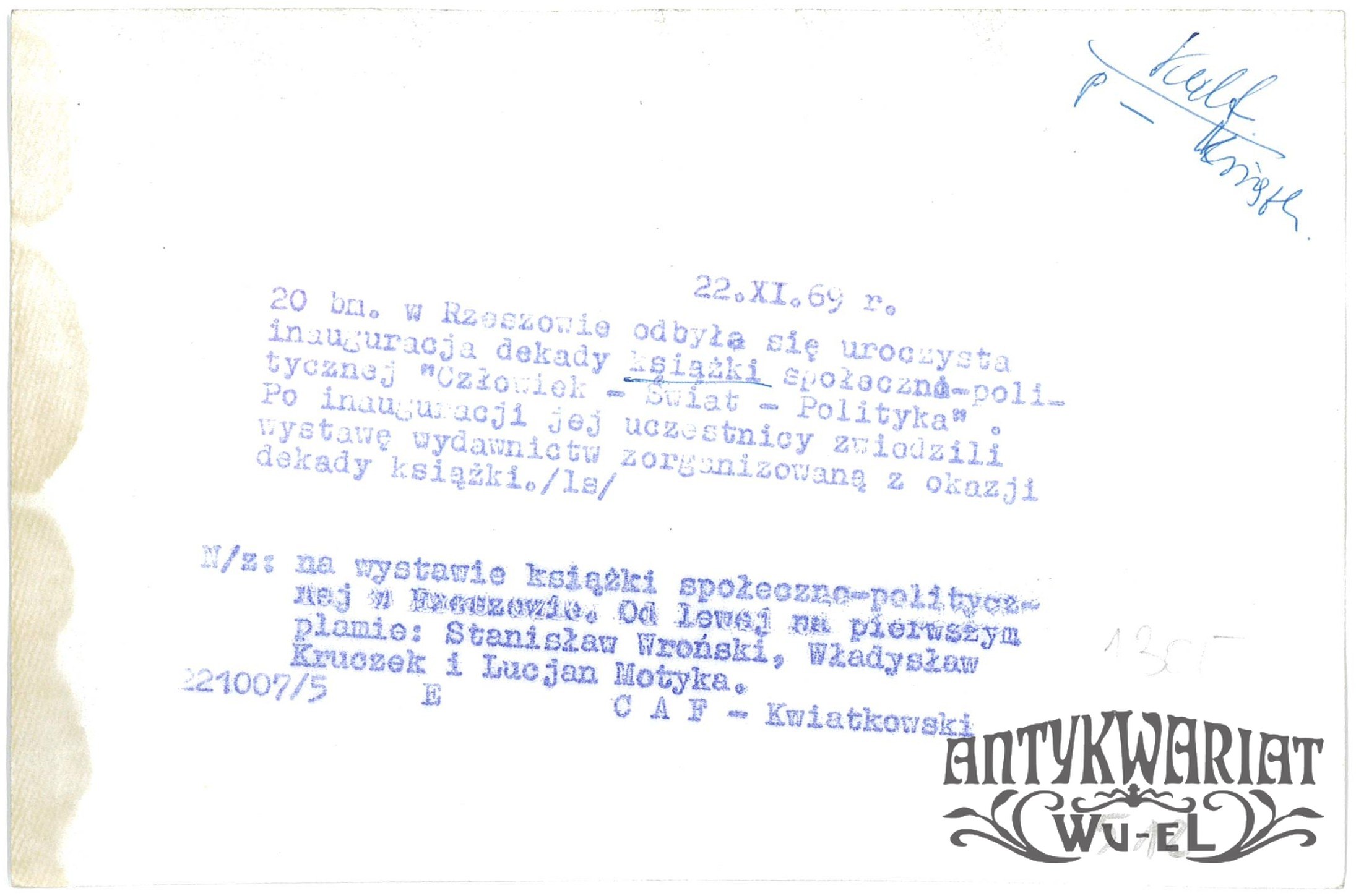 RZESZÓW. Na Wystawie Książki Społeczno-Politycznej, Stanisław Wroński, Władysłąw Kruczek i Lucjan Motyka; fot. CAF - Kwiatkowski, 22.11.1969 r.; stan bardzo dobry, wymiary: 18,2 x 11,9 cm
