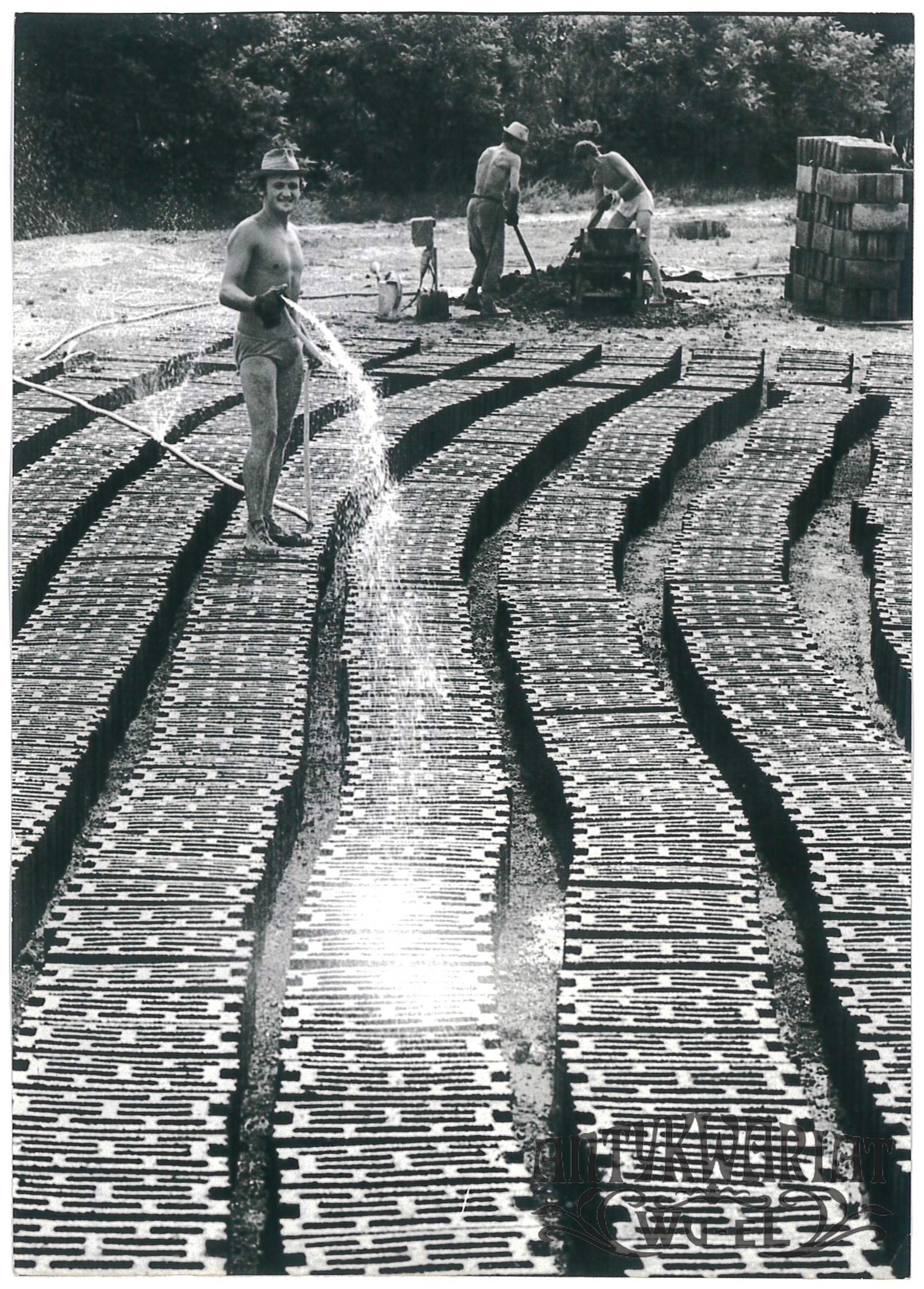 SOBIENIE-JEZIORY (pow. Otwock). Zakład betoniarski, pracownik polewający wodą gotowe pustaki; fot. CAF - Uchymiak; stan bardzo dobry, wymiary: 13 x 18,2 cm.