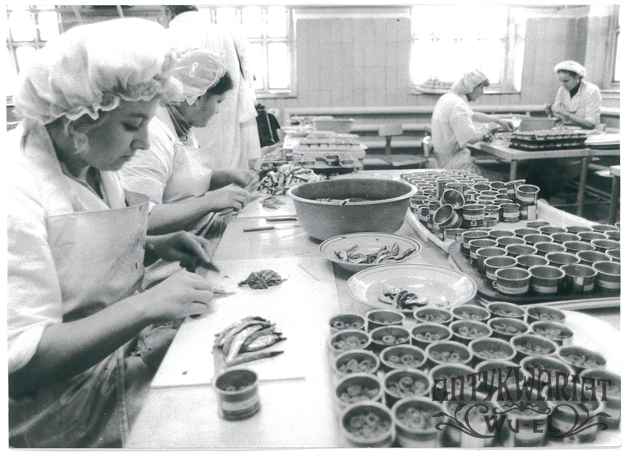 SULĘCIN. Zakład Przetwórczy KOGA, filetowanie i układanie koreczków anschois w puszkach; fot. CAF - R. Janowski, 26.02.1986 r.; sztan bardzo dobry, wymiary: 17,7 x 12,8 cm.