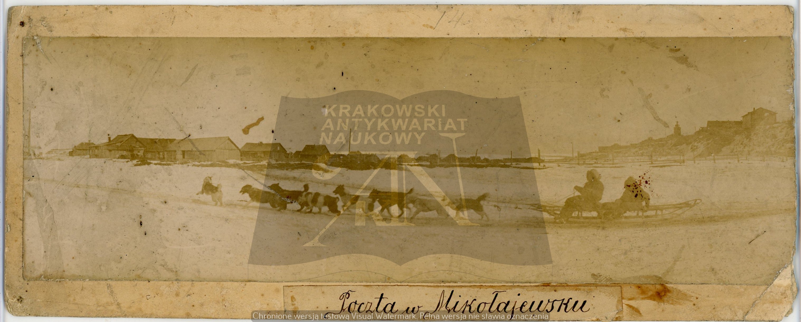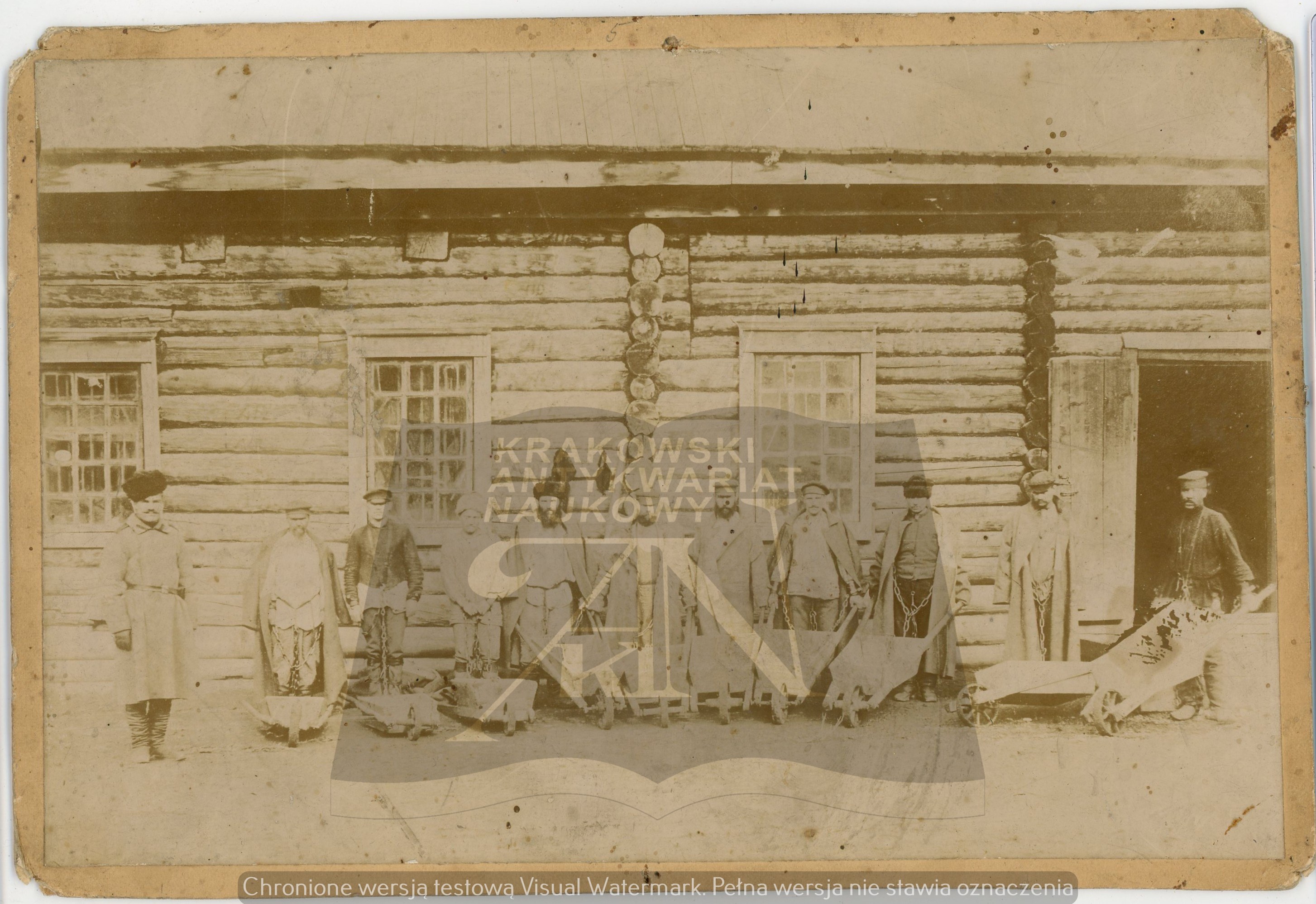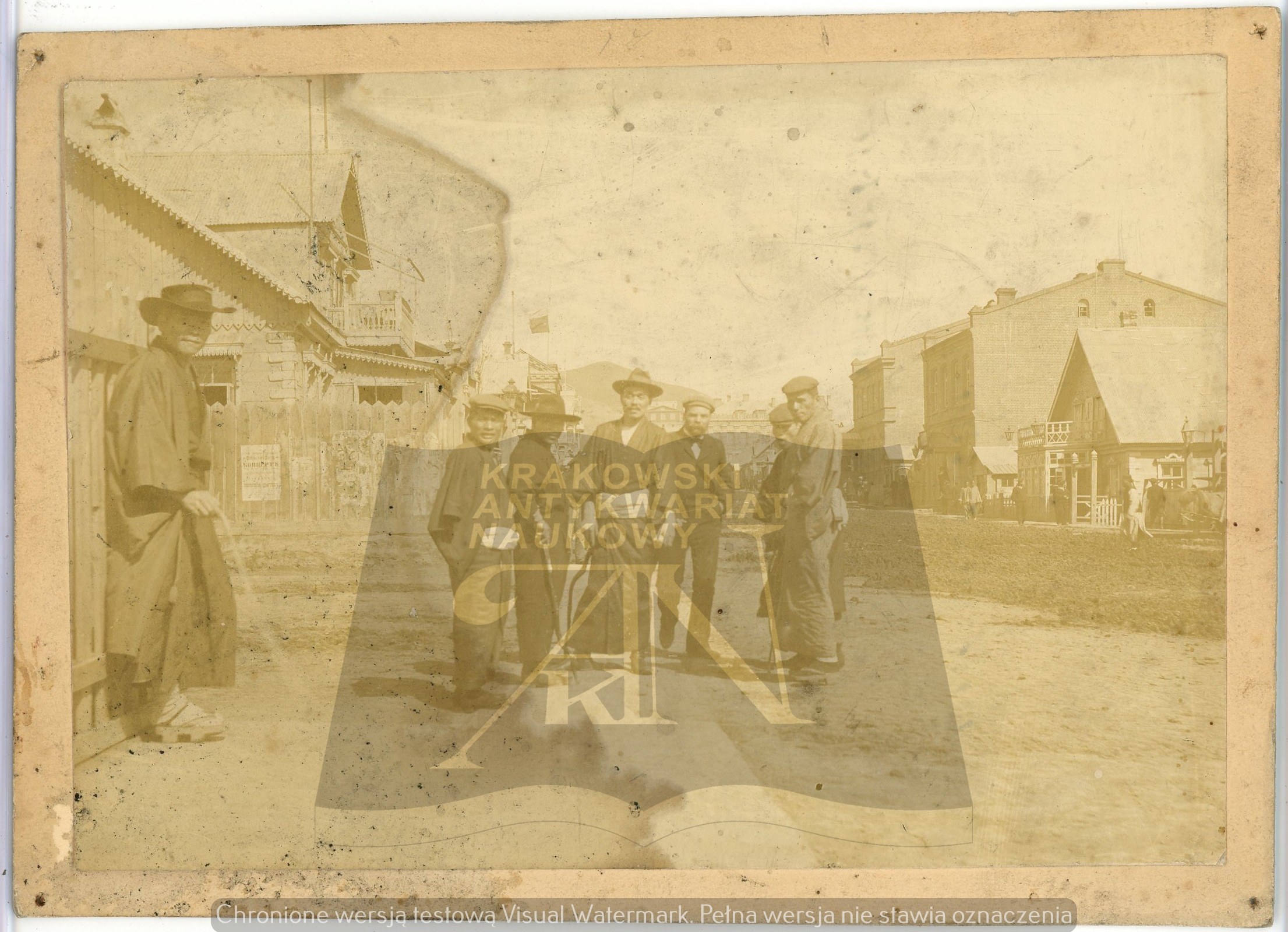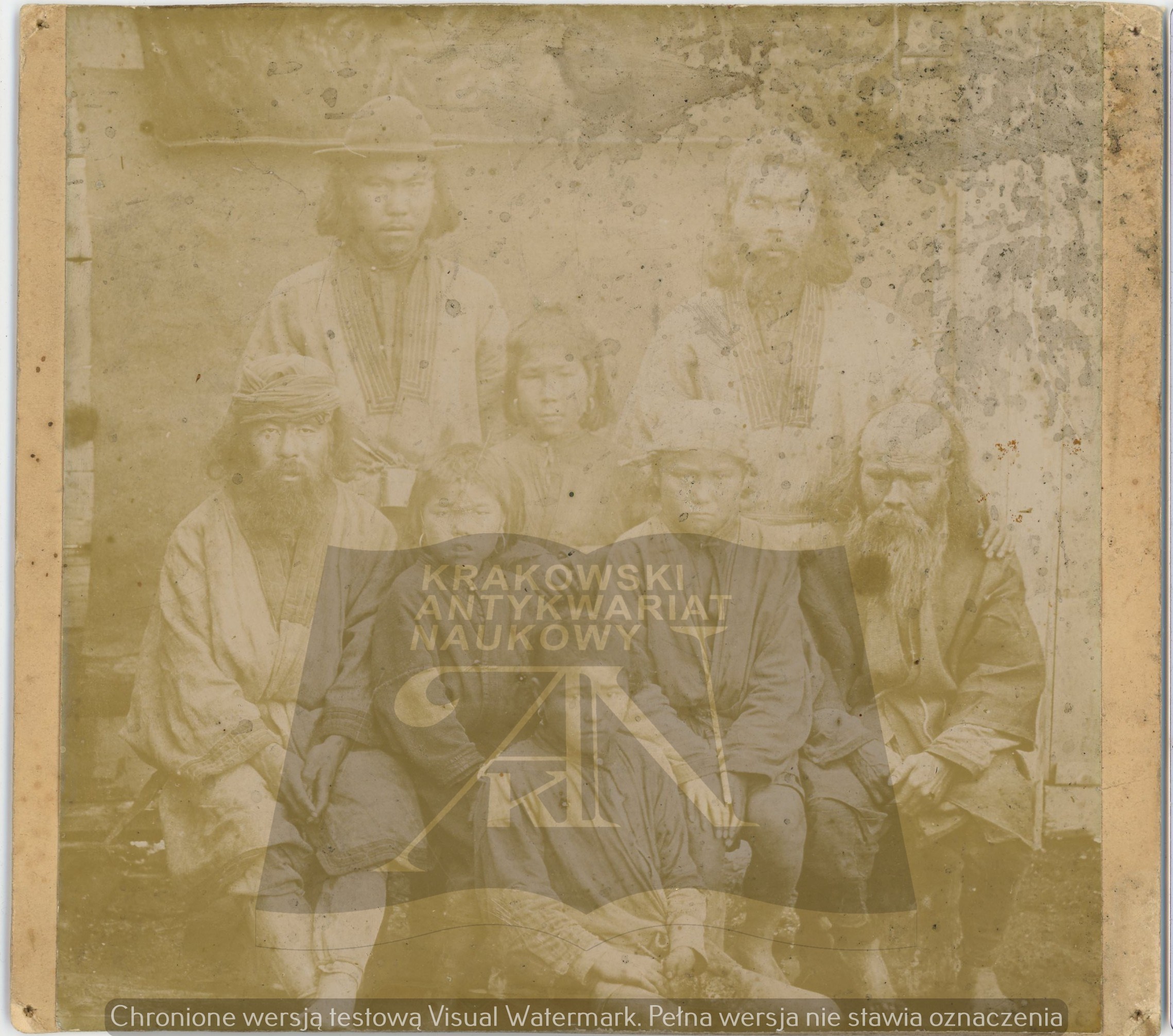 Wymiary zróżnicowane: nr 1 - 183 x 170 mm, podpisana Ajny; nr 2 - 237 x 157 mm, podpisana Gilaki; nr 3 - 232 x 141 mm, po prawej stronie najprawdopodobniej Bronisław Piłsudski; nr 4 - 253 x 102 mm, podpisana Poczta w Mikołajewsku; nr 5 - 129 x 189 mm każda; nr 6 - 123 x 177 mm; nr 7 - 183 x 132 mm; nr 8 - 194 x 135 mm; nr 9 - 243 x 165 mm; nr 10 - 122 x 188 mm. Razem 11 fotografii. Wymiary podane z kartonikiem. Narożne ślady po pinezkach, zabrudzenia i drobne uszkodzenia rogów i krawędzi. Fotografie nieznane w literaturze, unikalny zestaw.