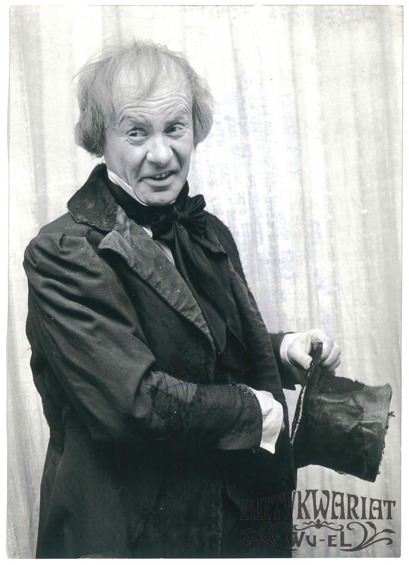 TADEUSZ ŁOMNICKI w roli Łatki w komedii A. Fredry "Dożywocie" w Teatrze Współczesnym w Warszawie' fot. CAF - Sokołowski, 24.12.1963 r.; stan bardzo dobry, wymiary: 13,2 x 18,5 cm