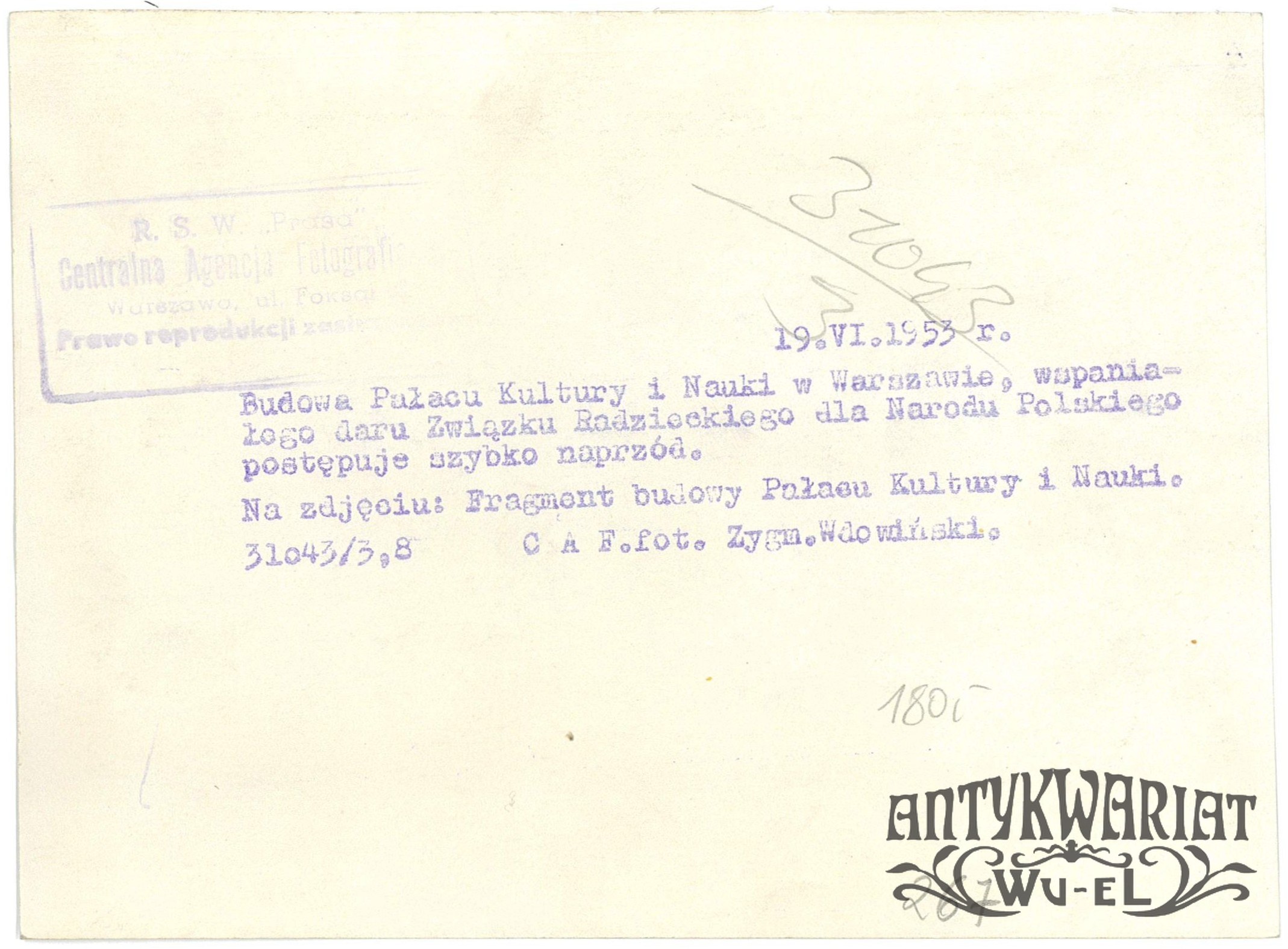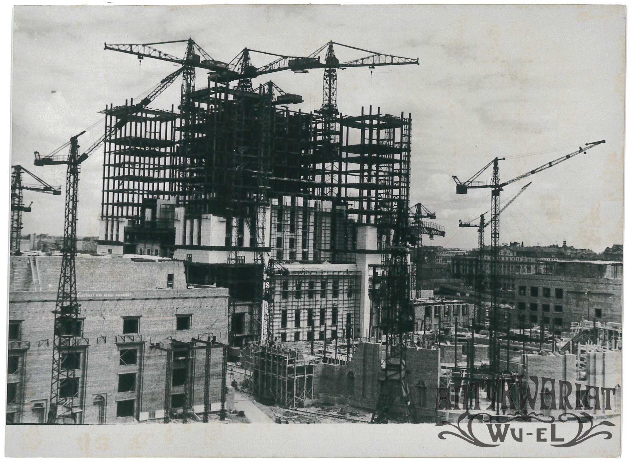 WARSZAWA. Budowa Pałacu Kultury i Nauki; fot. CAF - Zygmunt Wdowiński, 19.06.1953 r.; stan bardzo dobry minus, wymiary: 17,6 x 13 cm.