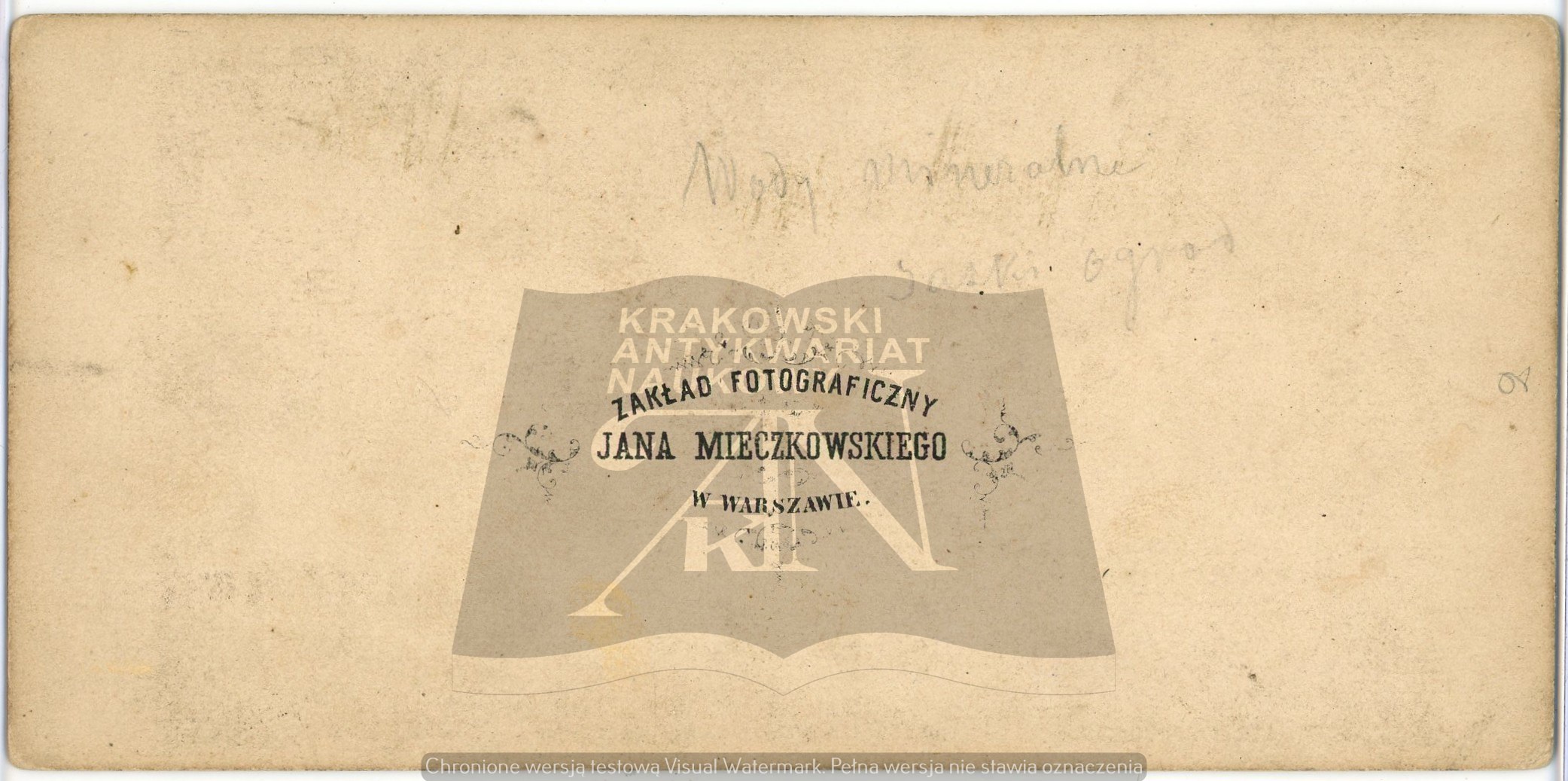 Wym.: 174 x 86 mm. Fotografia naklejona na firmowy kartonik zakł. fot. Jana Mieczkowskiego. Niewielkie zabrudzenia, poza tym stan dobry. Fotografia nieznana w literaturze.