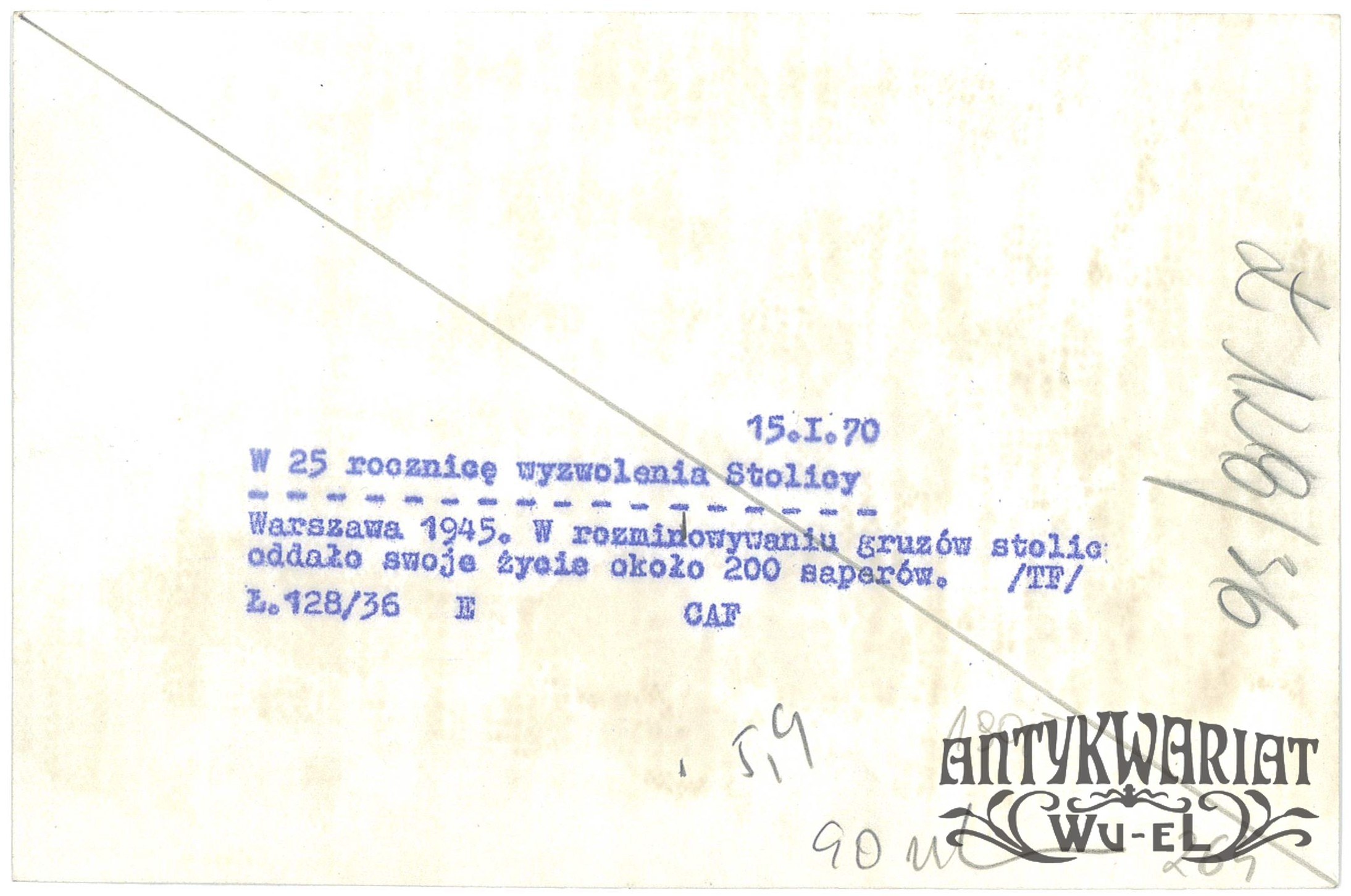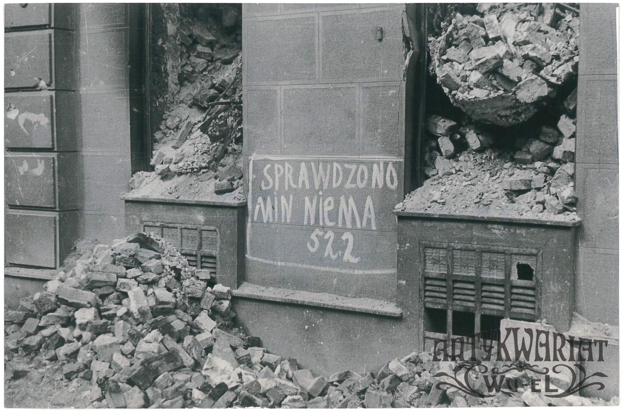 WARSZAWA. W 25 rocznicę wyzwolenia stolicy - odbitka zdjęcia z 1945 roku, napis na murze zrujnowanego budynku: "Sprawdzono, min nie ma" (w rozminowaniu gruzów stolicy oddało życie ok. 200 saperów); fot. CAF, 15.01.1970 r.; stan bardzo dobry, wymiary: 18,1 x 12 cm.