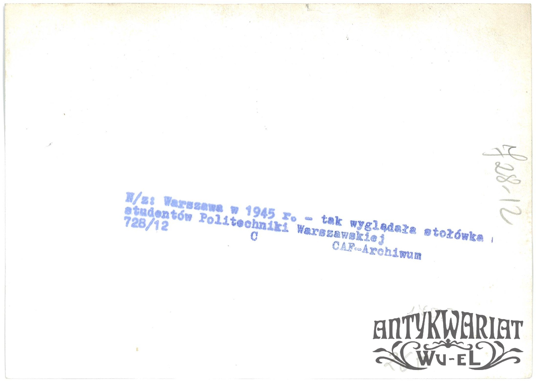 WARSZAWA. Stołówka studentów Politechniki Warszawskiej; fot. CAF - archiwum, 1945 r.; stan bardzo dobry minus, wymiary: 18,2 x 13 cm.