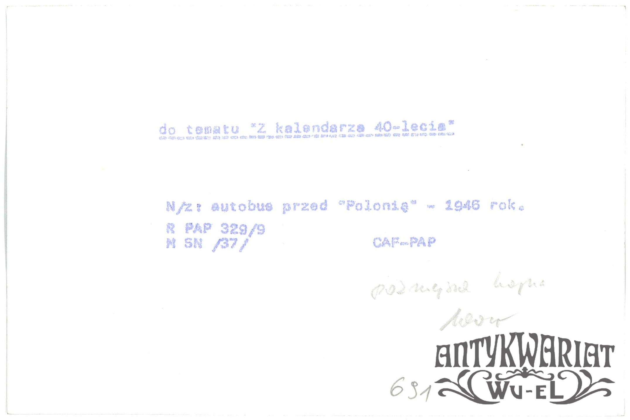 TRANSPORT PODRÓŻNYCH. Hotel Polonia w Warszawie, 1946 r. (późniejsza kopia); stan bardzo dobry, wymiary: 17,8 x 11,8 cm..