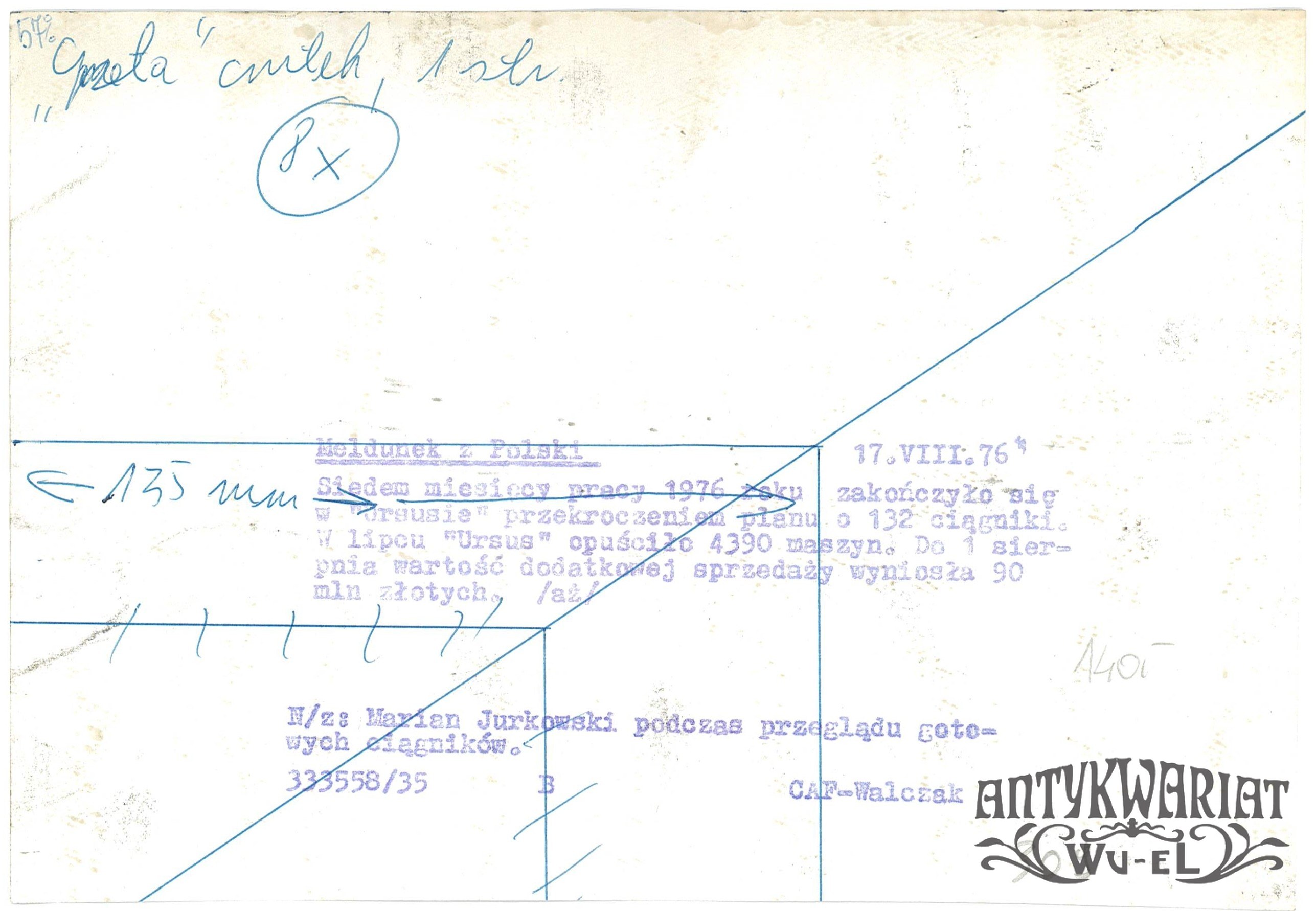 WARSZAWA. Ursus, Marian Jurkowski podczas przeglądu gotowych ciągników na placu przed zakładem; fot. CAF - Walczak, 17.08.1976 r.; stan bardzo dobry, wymiary: 21,4 x 14,8 cm.
