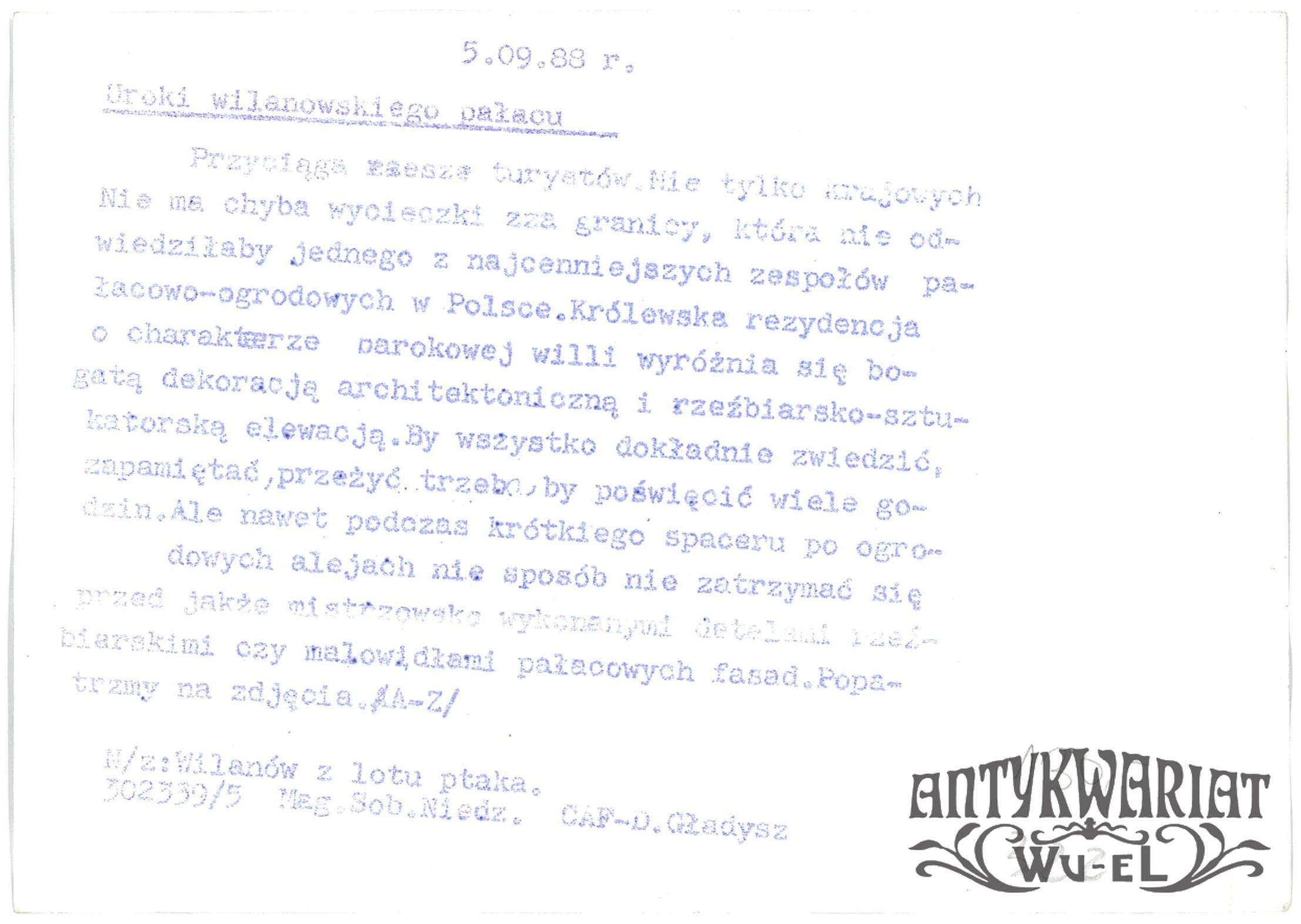 WARSZAWA. Wilanów z lotu ptaka; fot. CAF - D. Gładysz, 5.09.1988 r.; stan bardzo dobry minus, wymiary: 18,3 x 13 cm.
