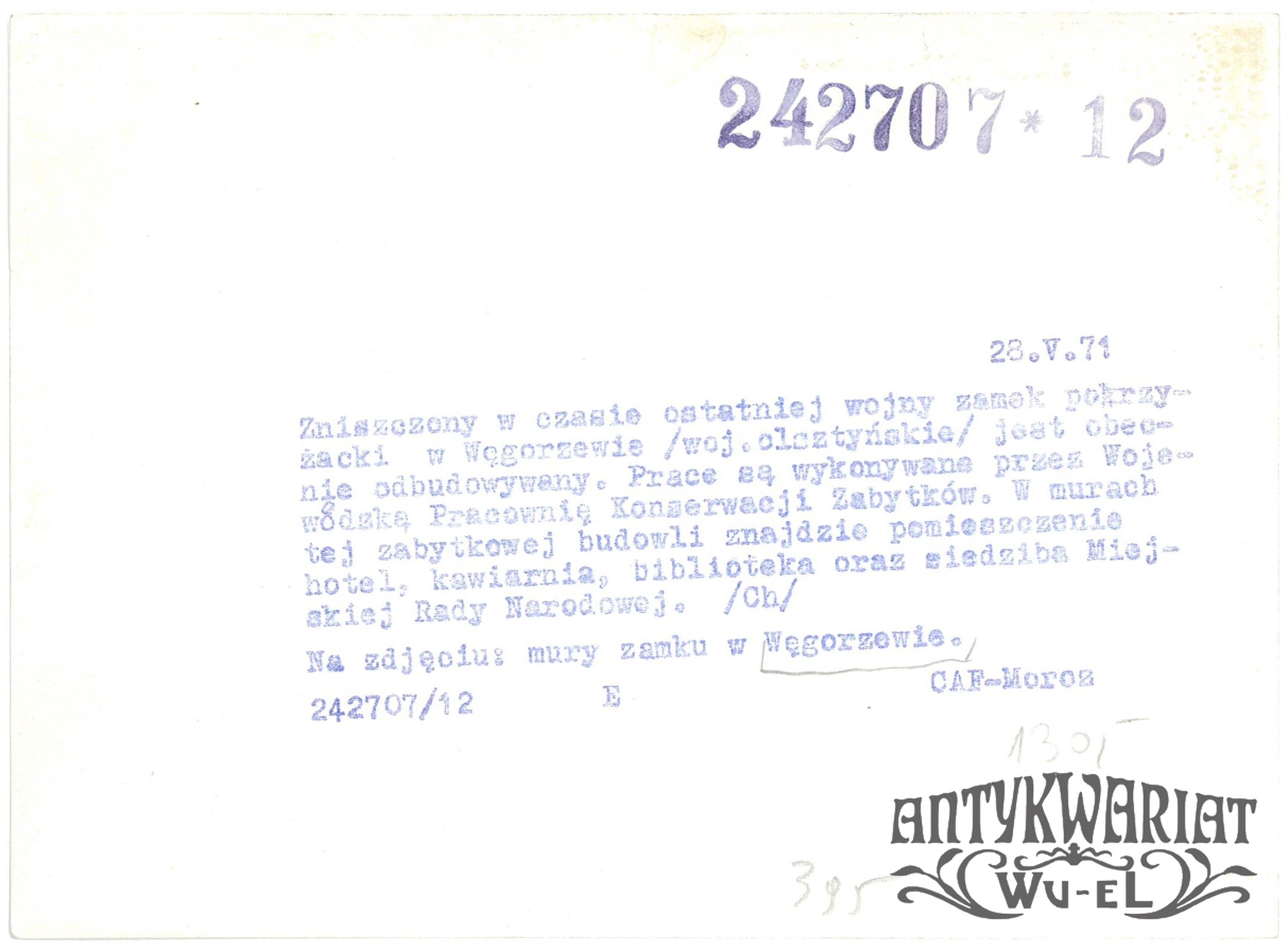 WĘGORZEWO. Zamek pokrzyżacki w trakcie odbudowy; fot. CAF - Moroz, 28.05.1971 r.; stan bardzo dobry, wymiary: 18 x 13,1 cm.