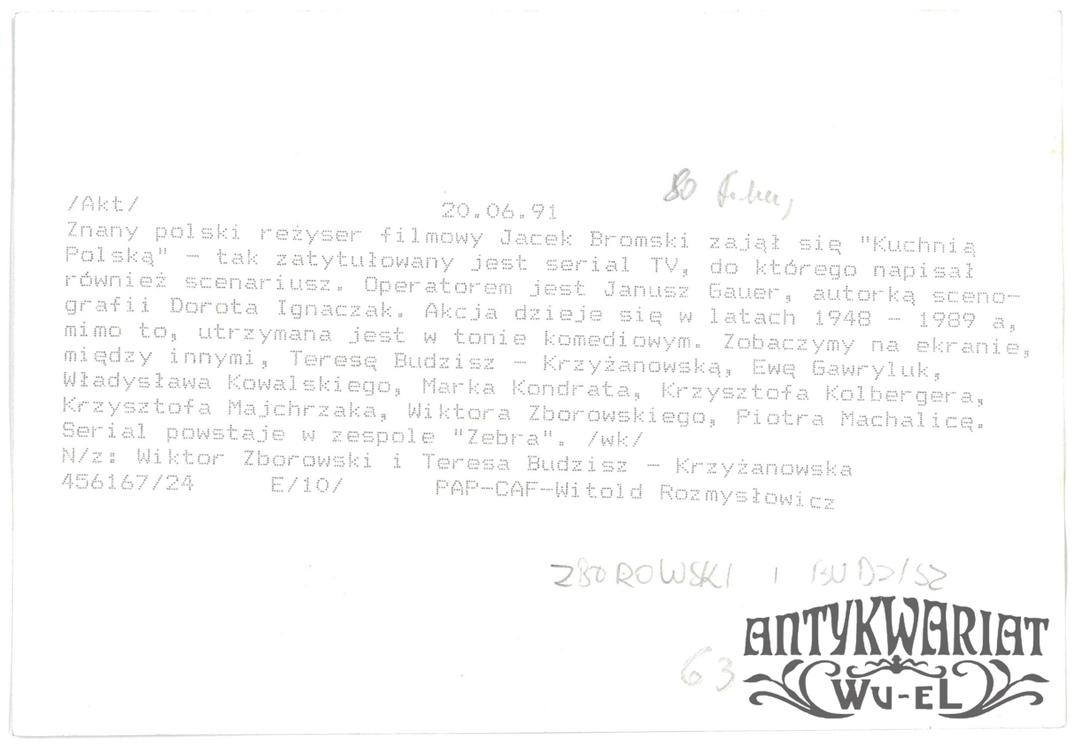 WIKTOR ZBOROWSKI i TERESA BUDZISZ-KRZYŻANOWSKA w serialu komediowym "Kuchnia polska"; fot. CAF - Witold Rozmysłowicz, 20.06.1991 r.; stan bardzo dobry, wymiary: 17,8 x 12,2 cm.