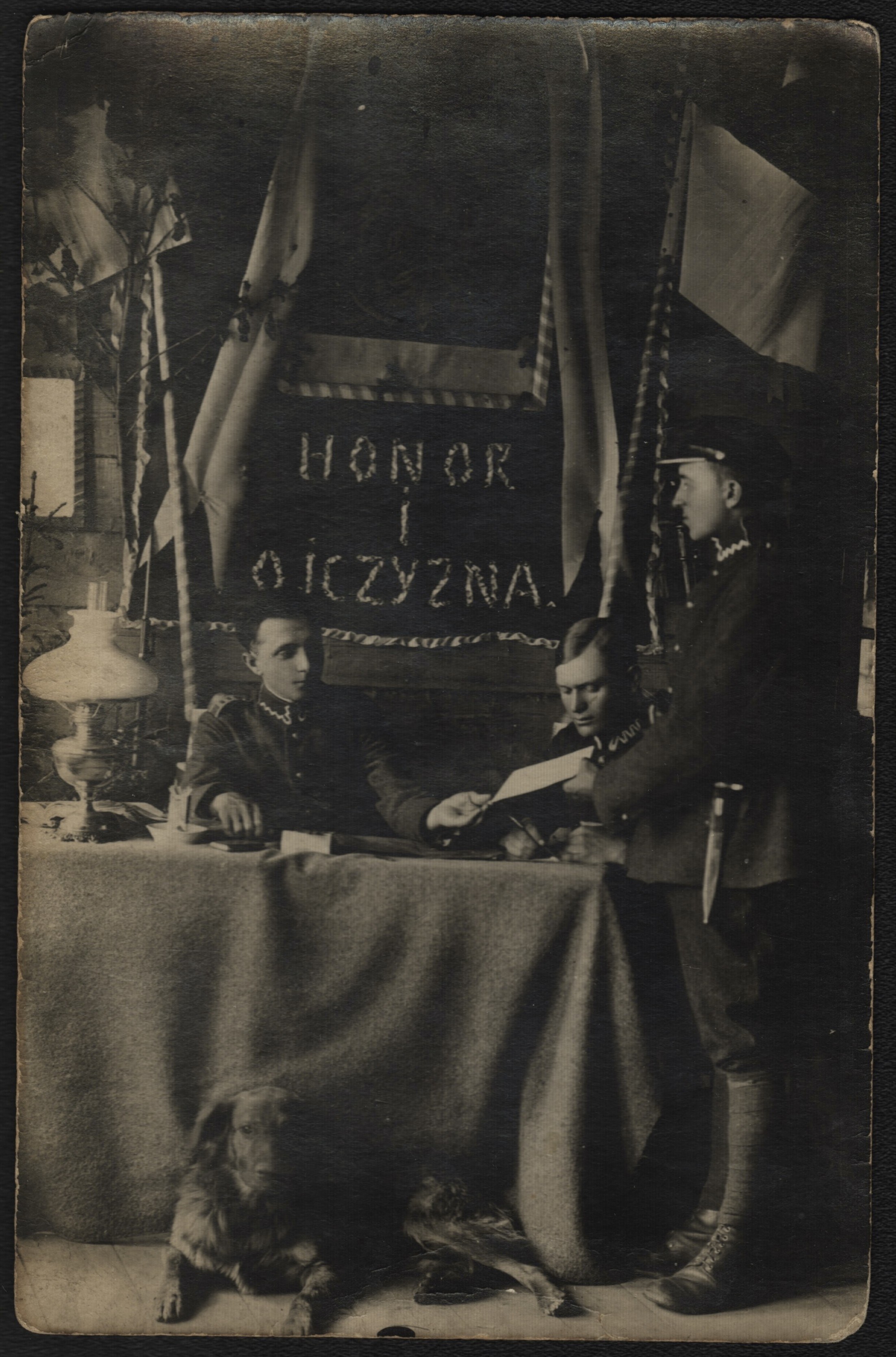 Wojsko Polskie] Fotografia pozowana żołnierzy Wojska Polskiego. W tle Orzeł Biały oraz hasło "Honor i Ojczyzna". 10 VI 1926 r.