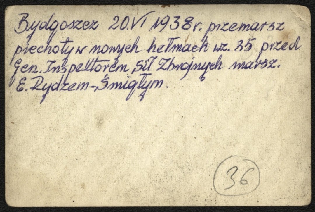 WOJSKO POLSKIE] Przemarsz piechoty w nowych hełmach wz. 35 przed Gen. Inspektorem Sił Zbrojnych marsz. E. Rydzem-Śmigłym. Bydgoszcz 20.VI. 1938 r.