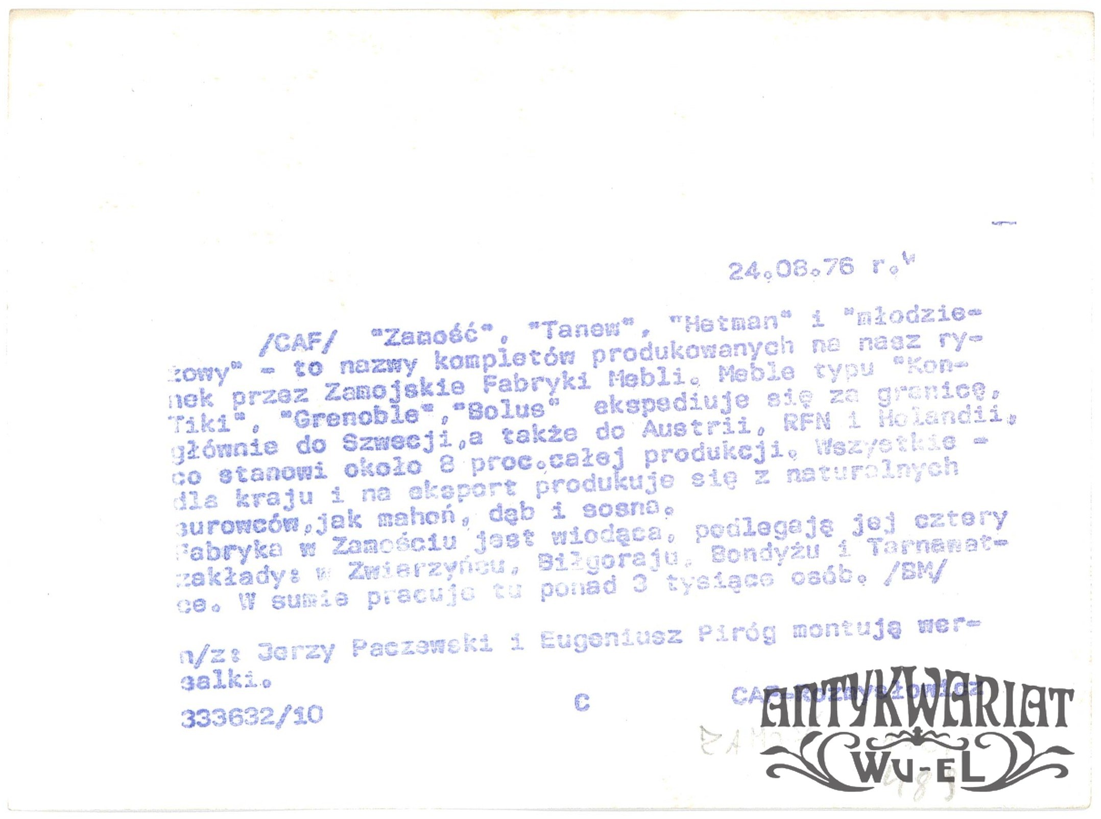 ZAMOŚĆ. Zamojskie Fabryki Mebli, montaż wersalki; fot. CAF - Rozmysłowicz, 24.08.1976 r.; stan bardzo dobry, wymiary: 18 x 13,2 cm.