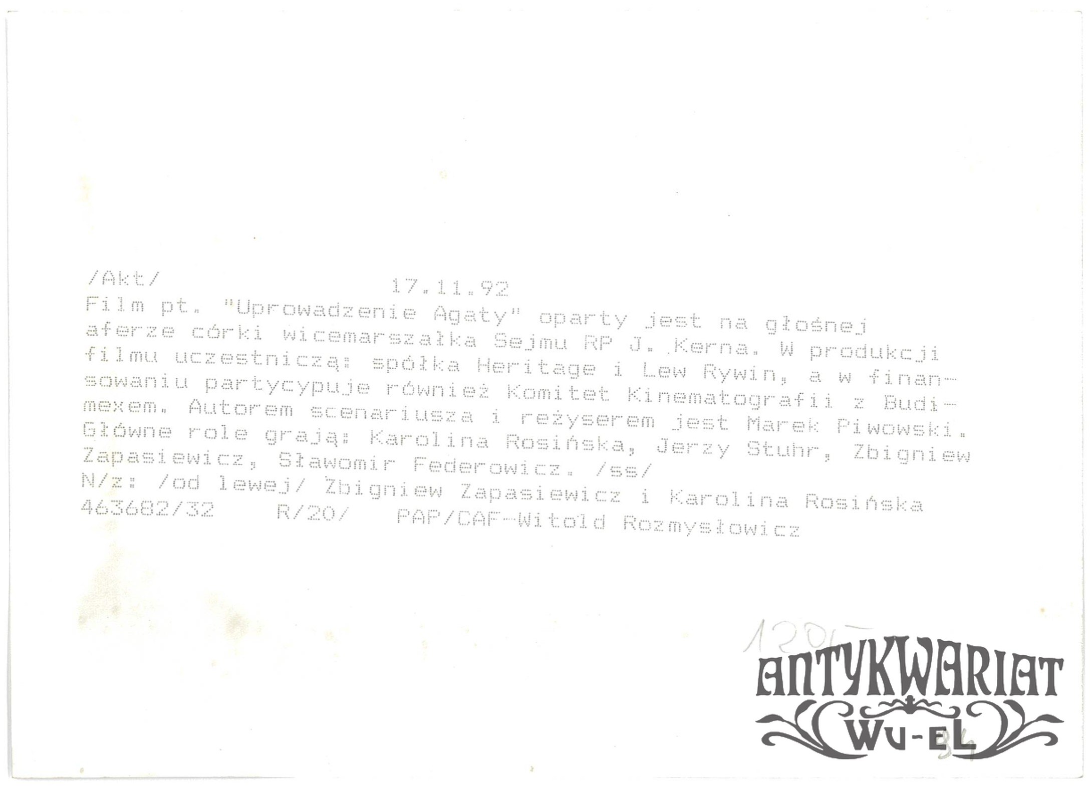 ZBIGNIEW ZAPASIEWICZ i KAROLINA ROSIŃSKA na planie filmu "Uprowadzenie Agaty"; fot. CAF - Witold Rozmysłowicz, 17.11.1992 r.; stan bardzo dobry, wymiary: 18,1 x 12,9 cm.